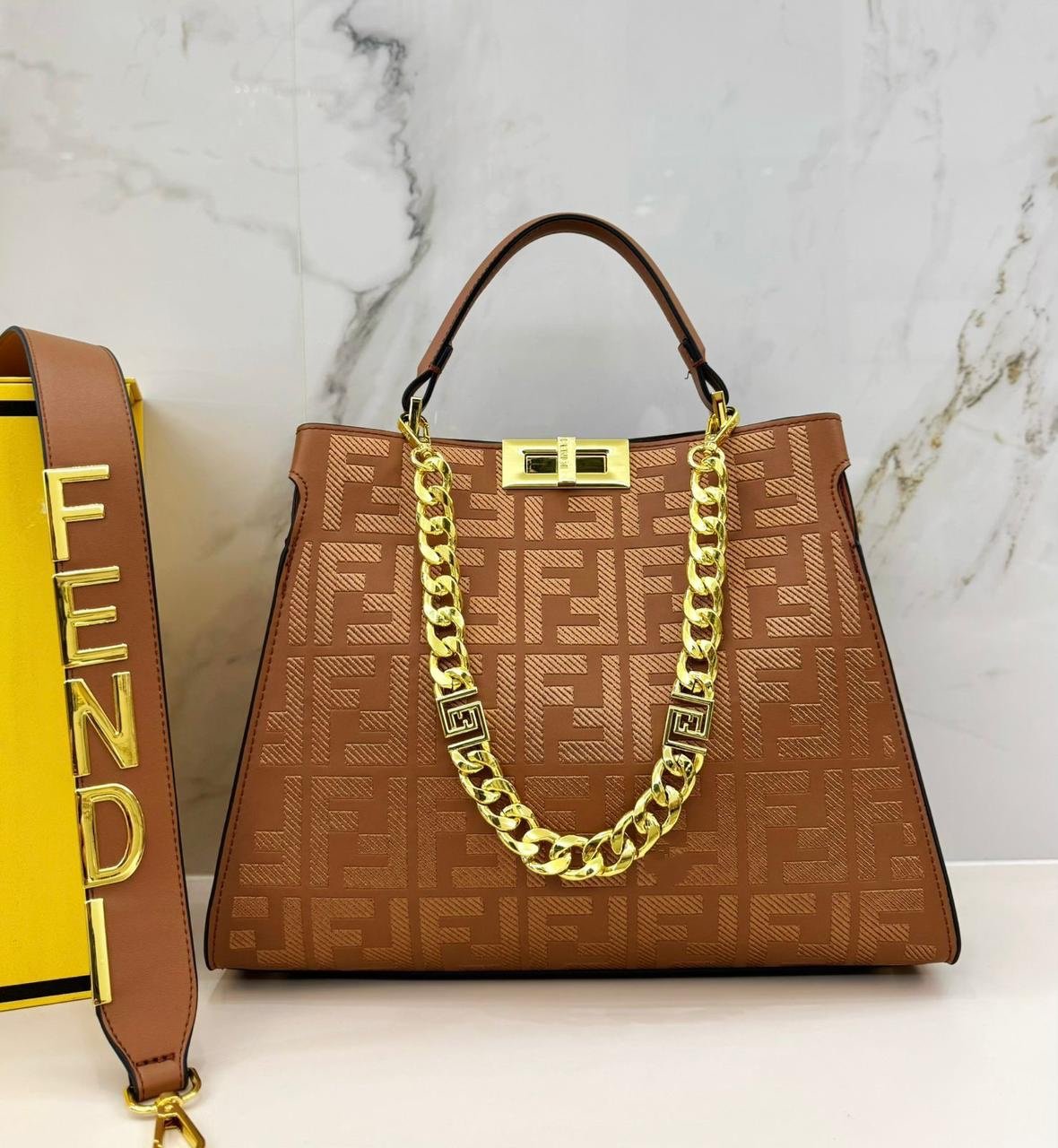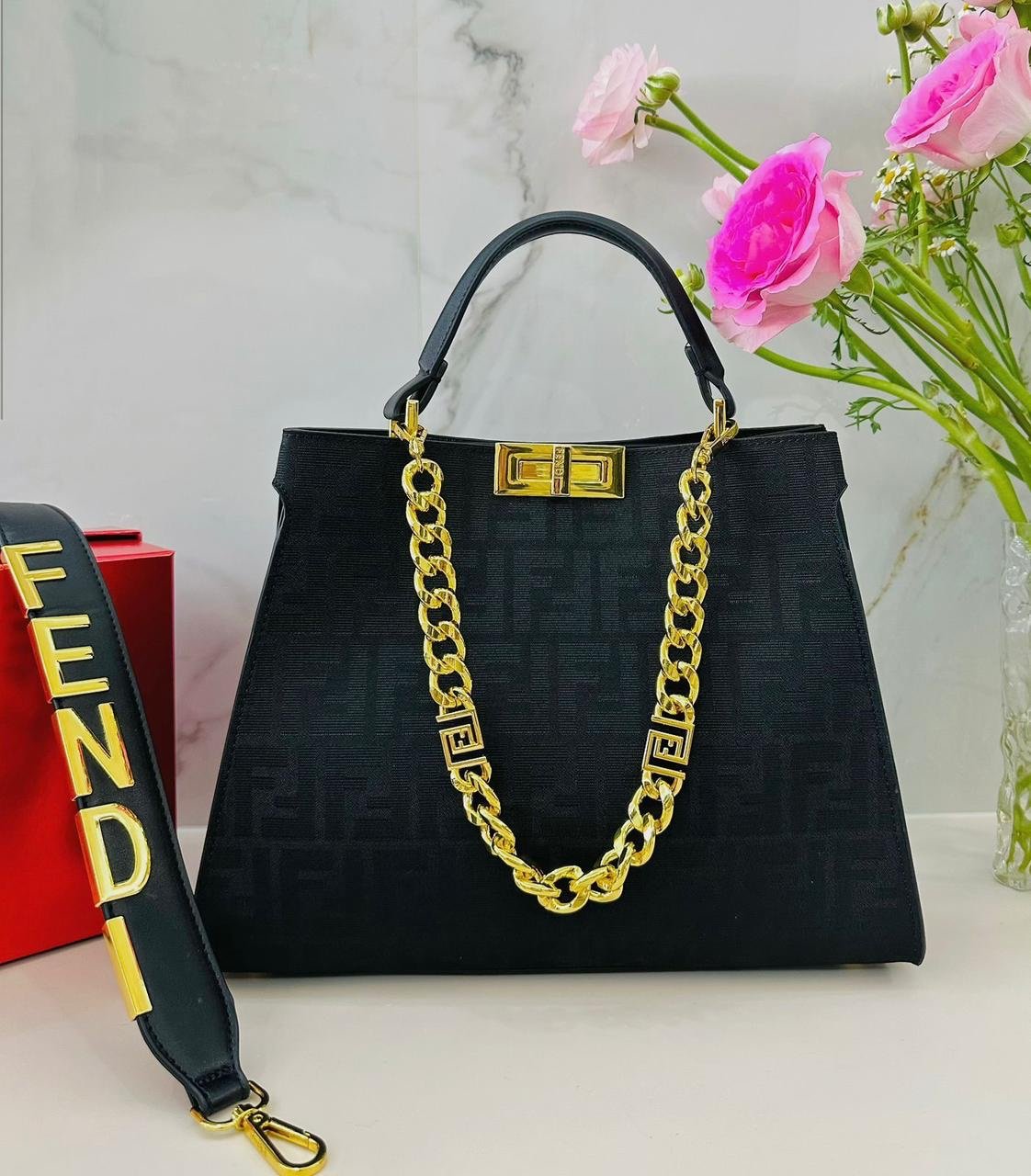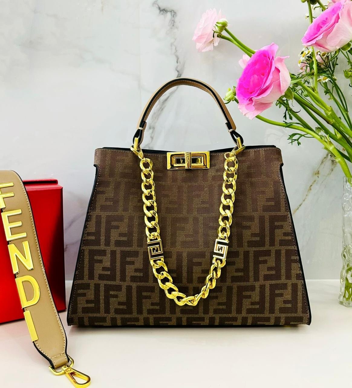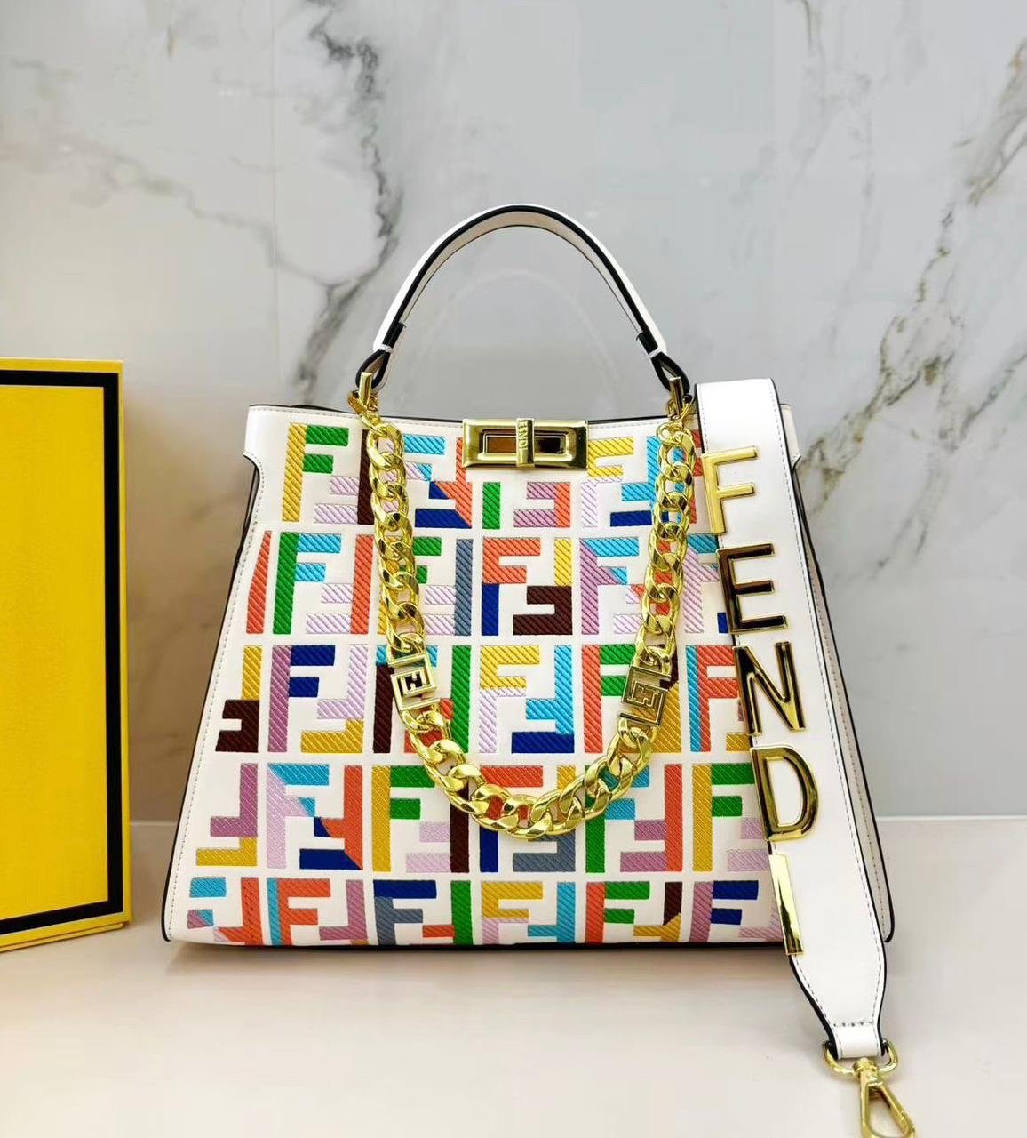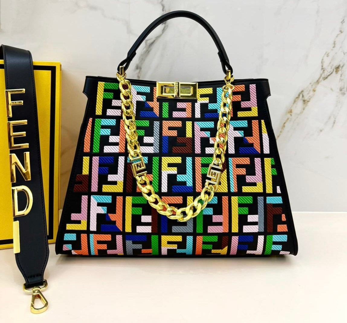 فندي (Fendi) الشهيرة، وتحديداً موديل بيكابو (Peekaboo) الأيقوني. تتميز هذه الحقائب بتصميمها الكلاسيكي الذي يجمع بين الأناقة والعملية.