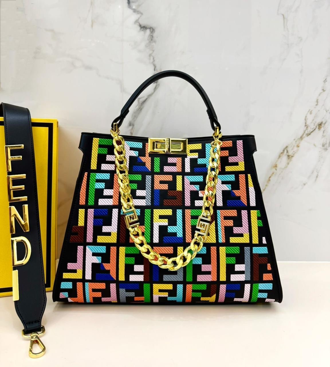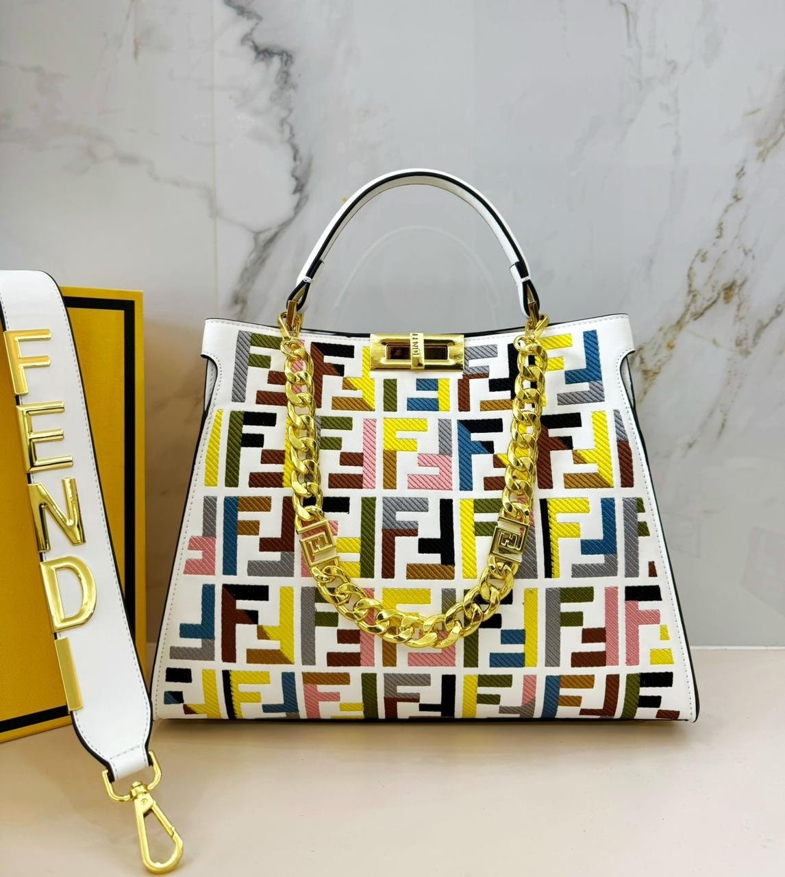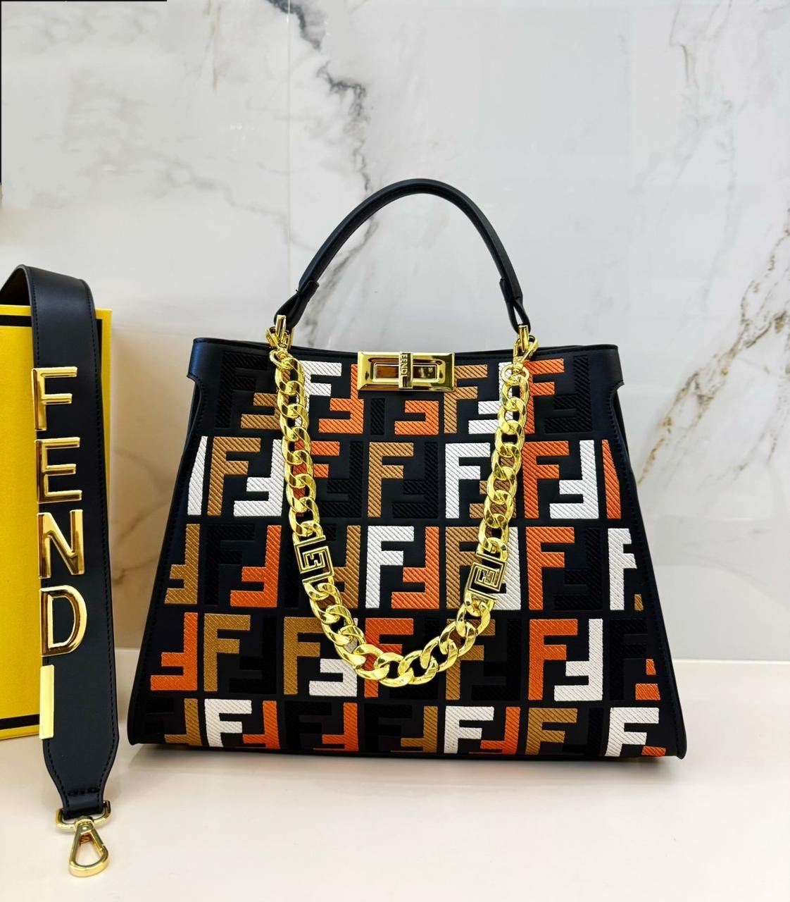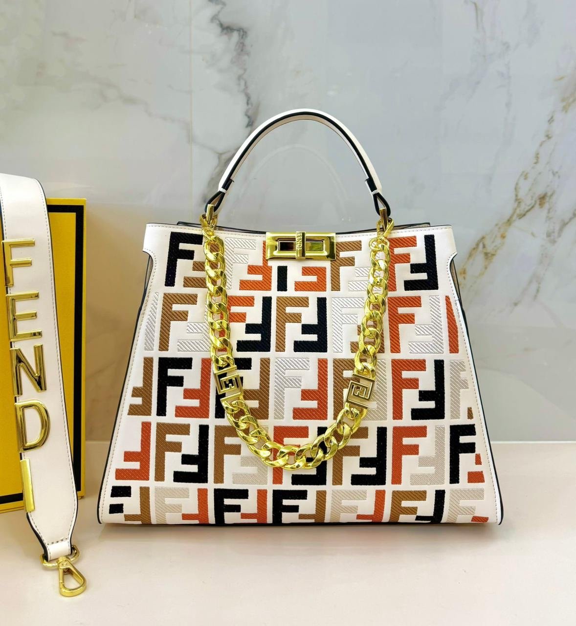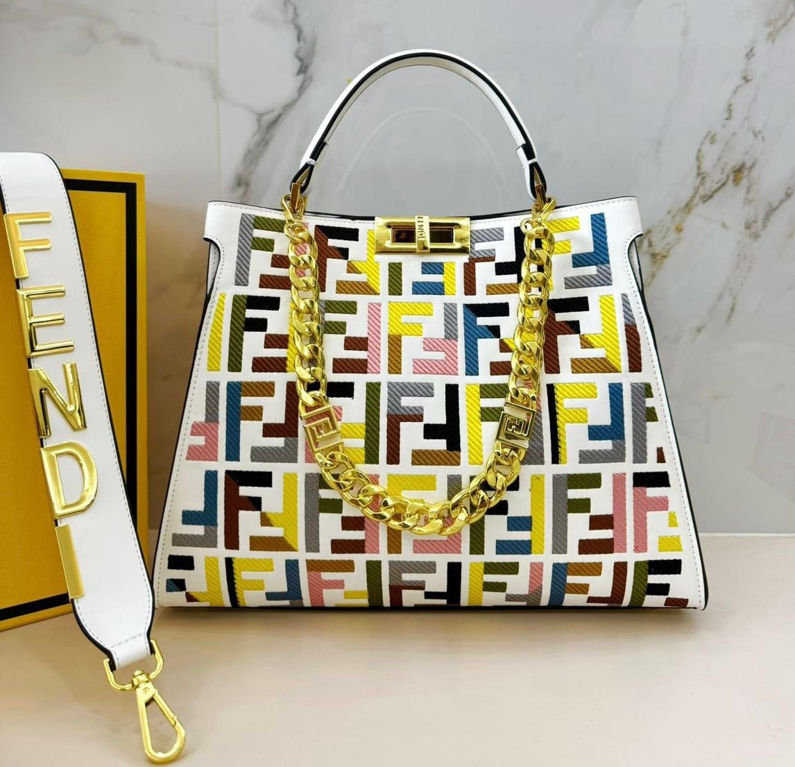 فندي (Fendi) الشهيرة، وتحديداً موديل بيكابو (Peekaboo) الأيقوني. تتميز هذه الحقائب بتصميمها الكلاسيكي الذي يجمع بين الأناقة والعملية.
