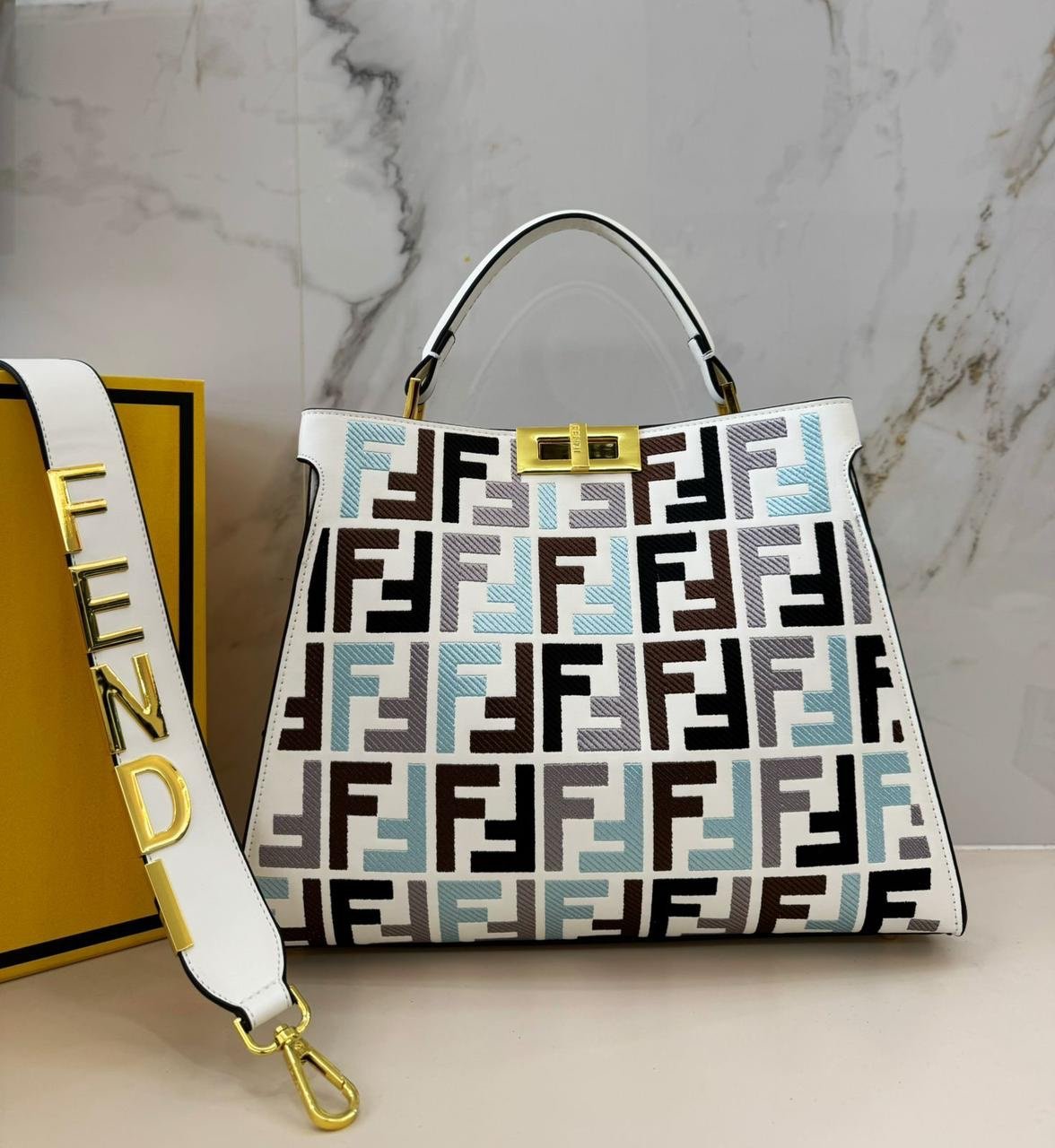 - نقشة شعار “FF“ الشهيرة بألوان كلاسيكية مثل البني والأسود.