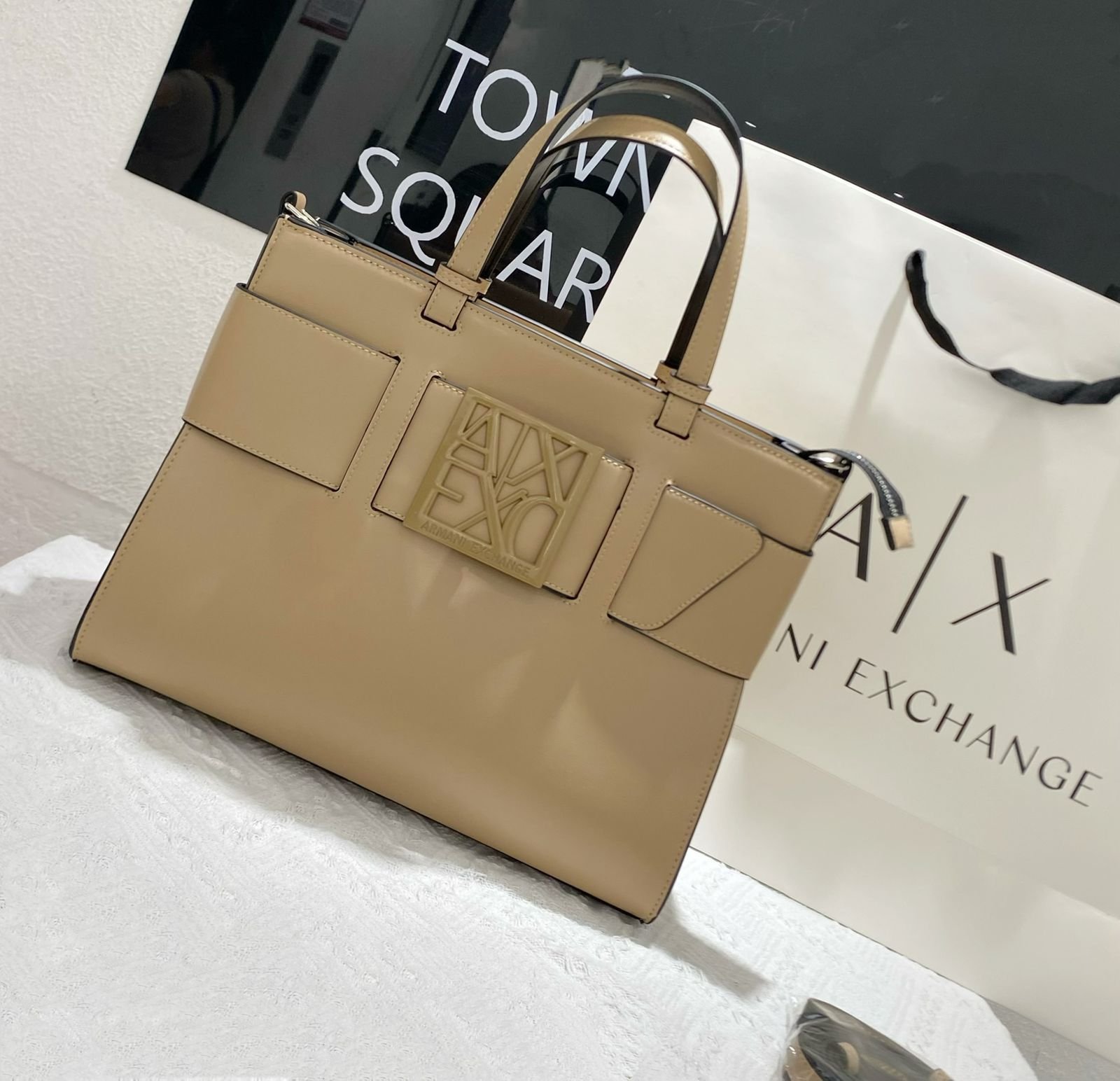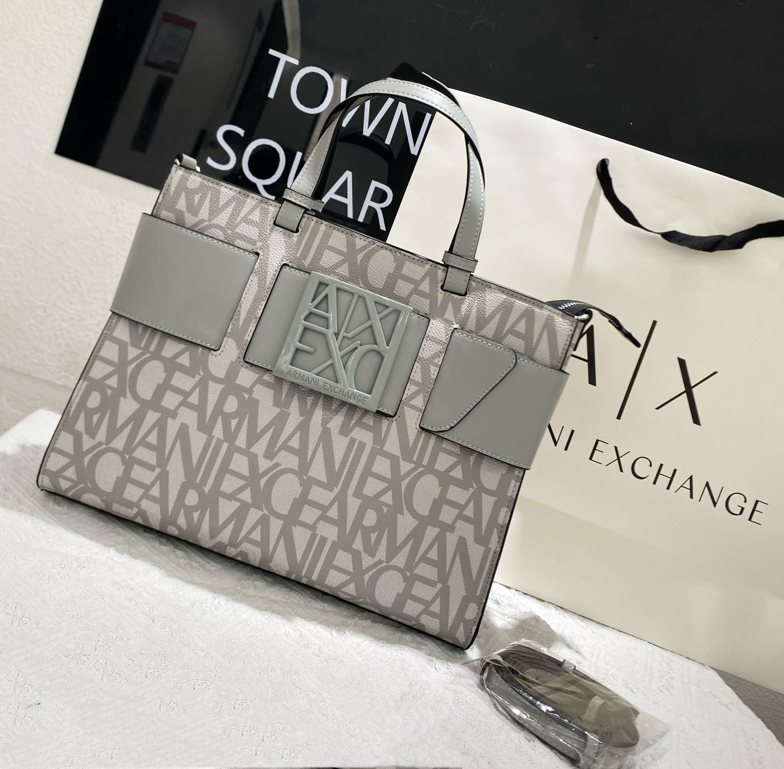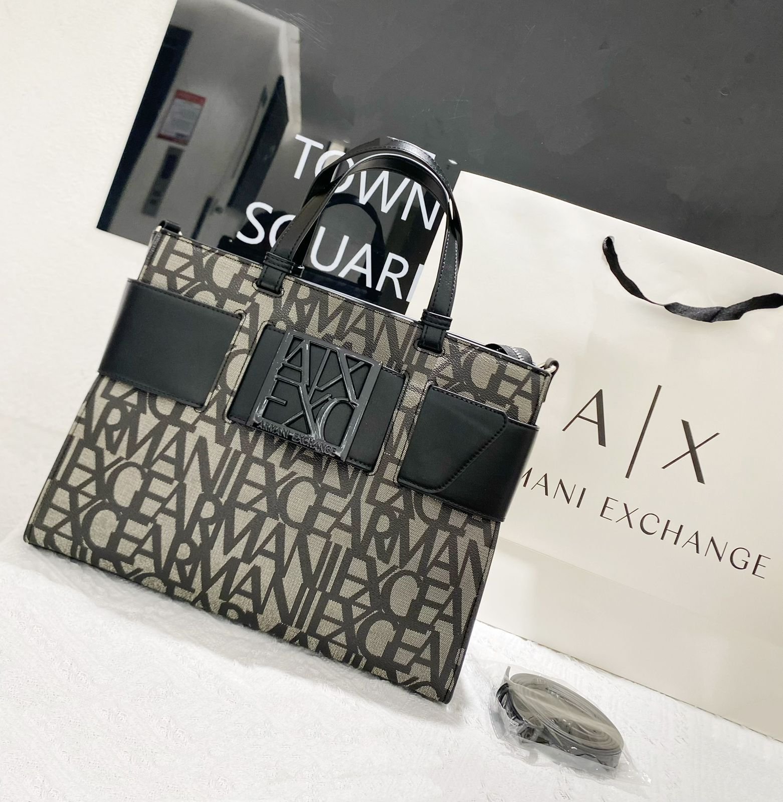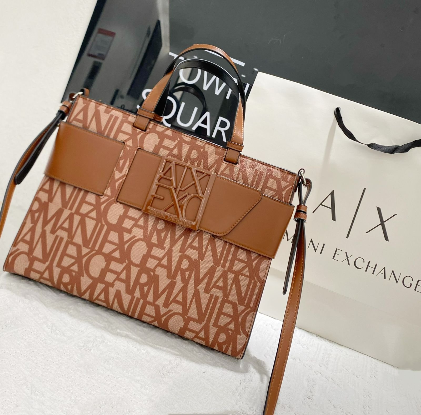 تُعرف هذه الحقيبة باسم Armani Exchange AX Plaque Big Tote Bag، وهي جزء من مجموعة Armani Exchange التي تجمع بين الأناقة العصرية والعملية اليومية.