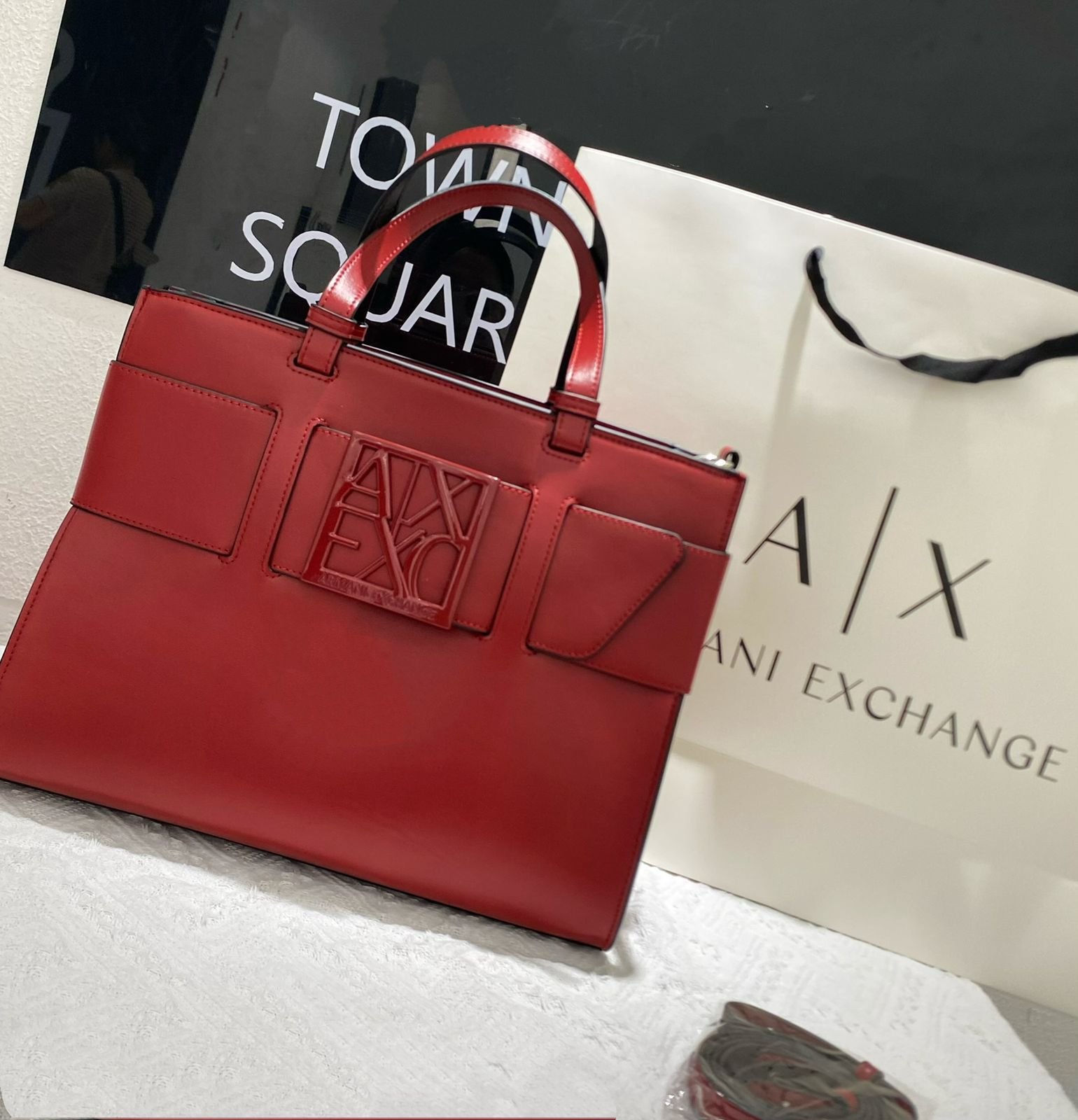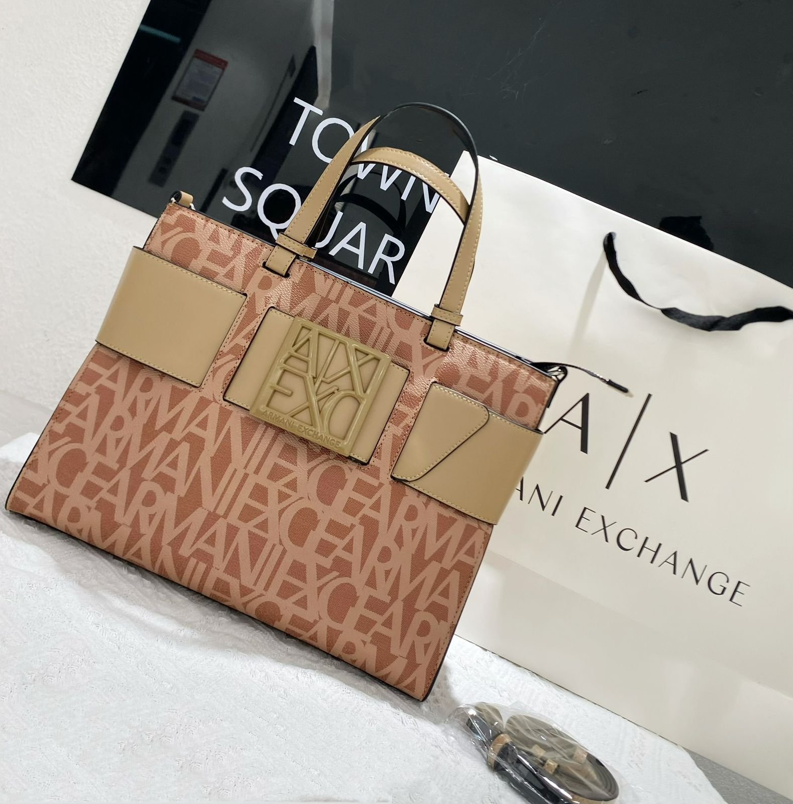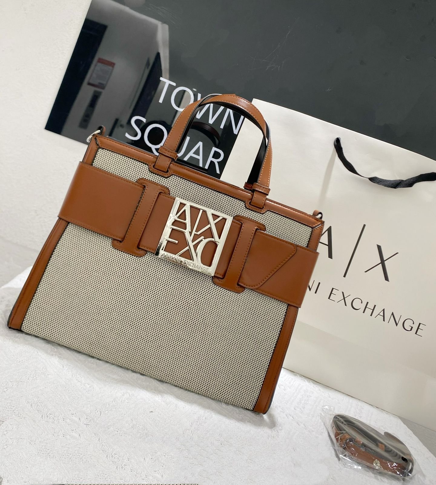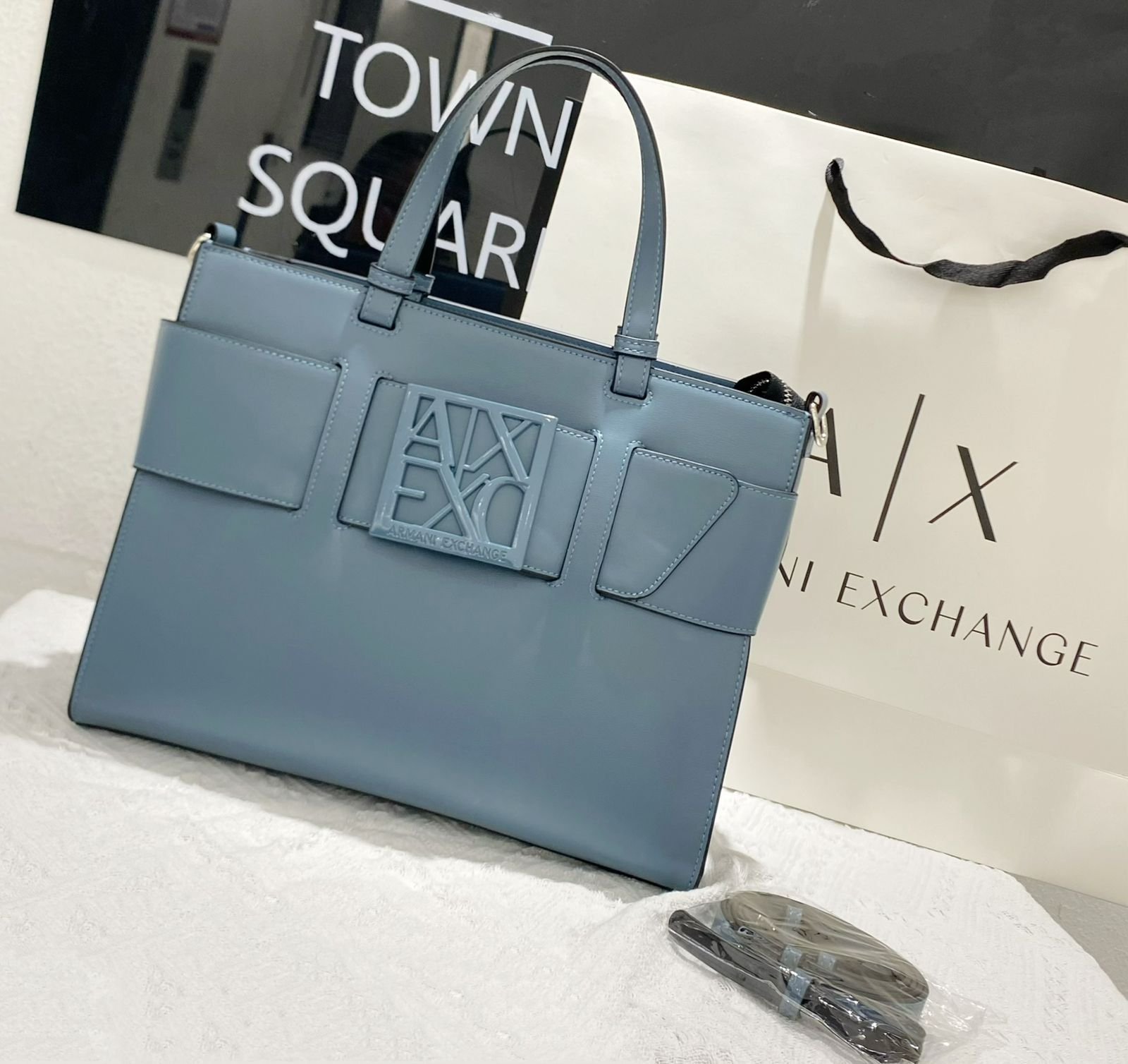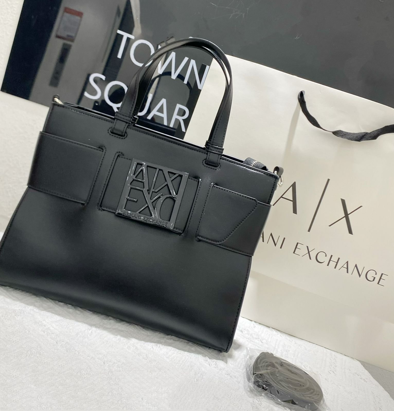 تُعرف هذه الحقيبة باسم Armani Exchange AX Plaque Big Tote Bag، وهي جزء من مجموعة Armani Exchange التي تجمع بين الأناقة العصرية والعملية اليومية.
