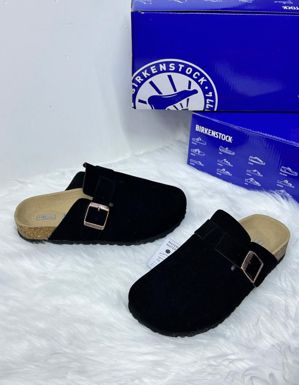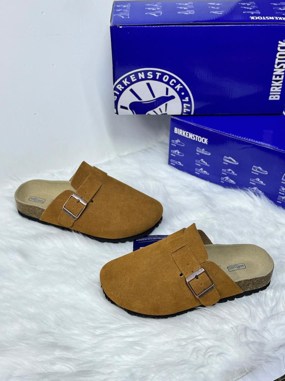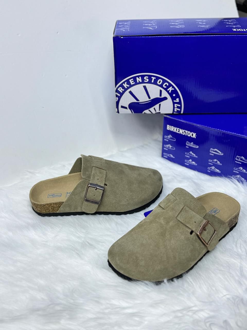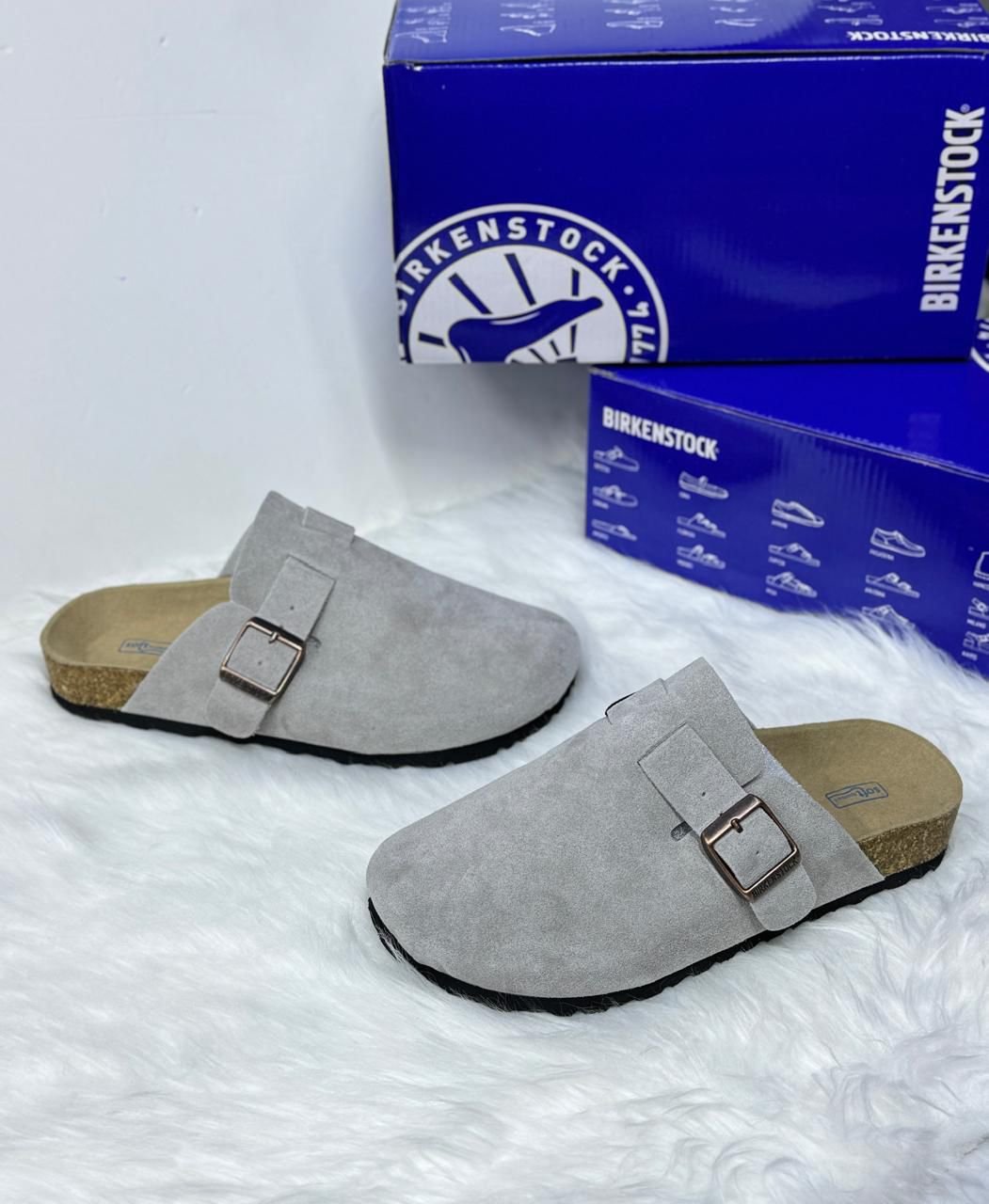 Birkenstock Boston، وهو تصميم كلاسيكي “كلوج” (Clog) يشتهر بجزئه العلوي المصنوع من جلد الشمواه (Suede) ونعل الفلين المريح.