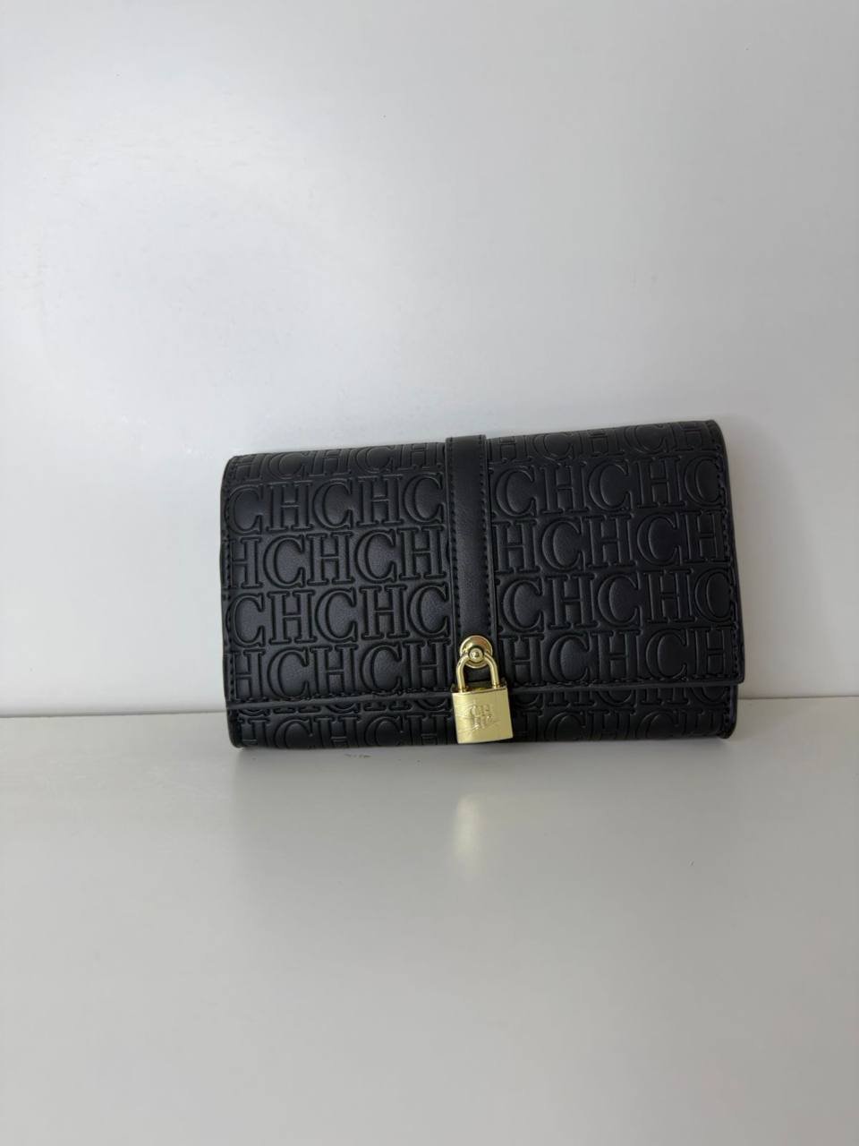حقيبة يد أو محفظة كلاسيكية من ماركة كارولينا هيريرا (Carolina Herrera)، وتحديداً من مجموعة (CH) التي تتميز بنقش شعار الماركة المحفور (Embossed Monogram) على الجلد.