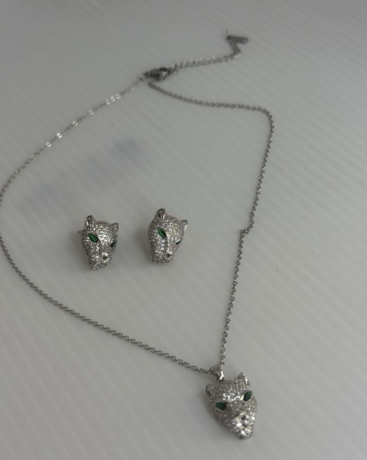 تظهر الصورة طقم إكسسوارات فاخر يتكون من قلادة وأقراط متطابقة، وهو ينتمي لمجموعة “Panthère de Cartier” (بانثير دو كارتييه) الشهيرة من دار كارتييه.