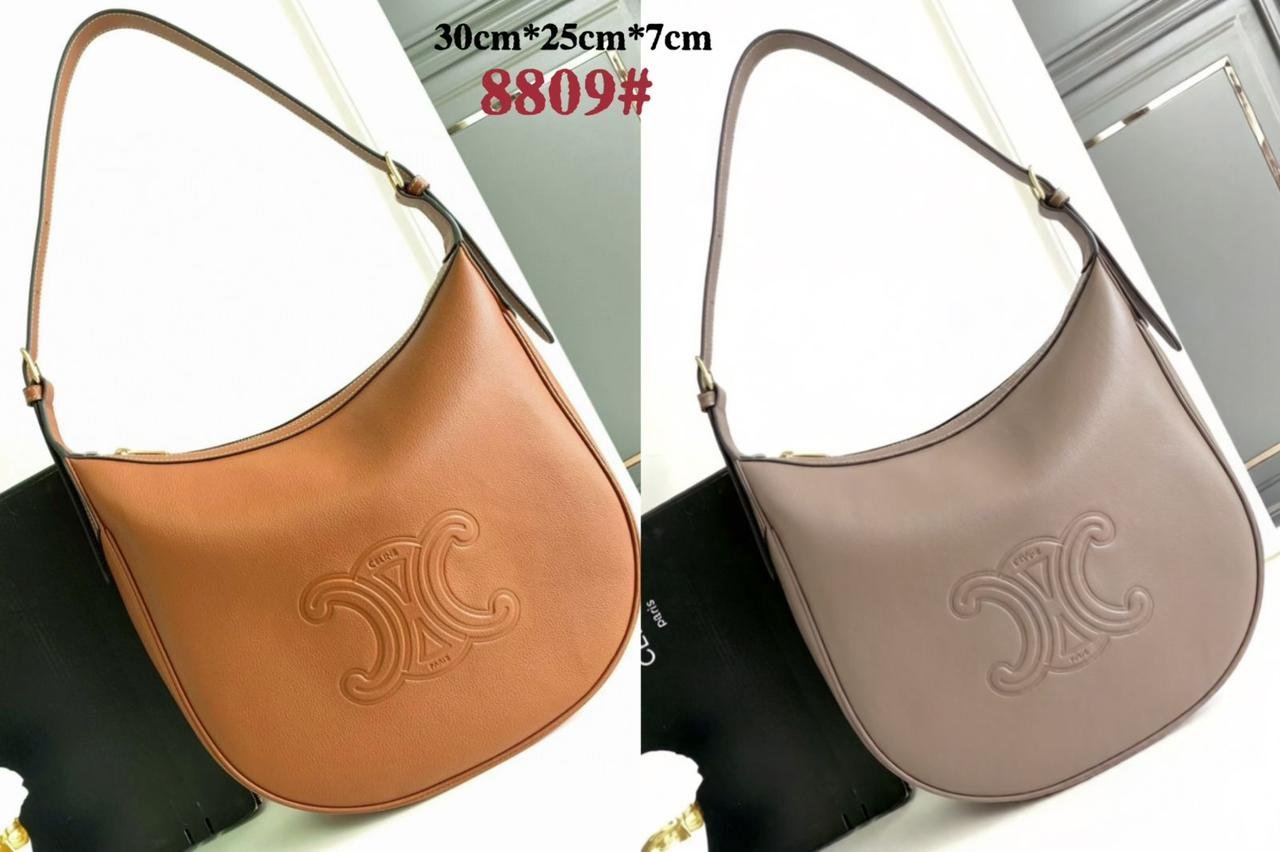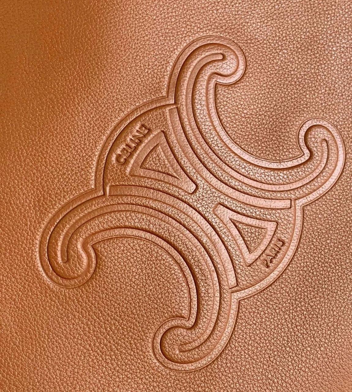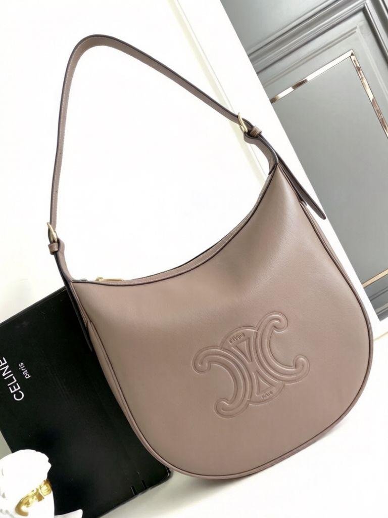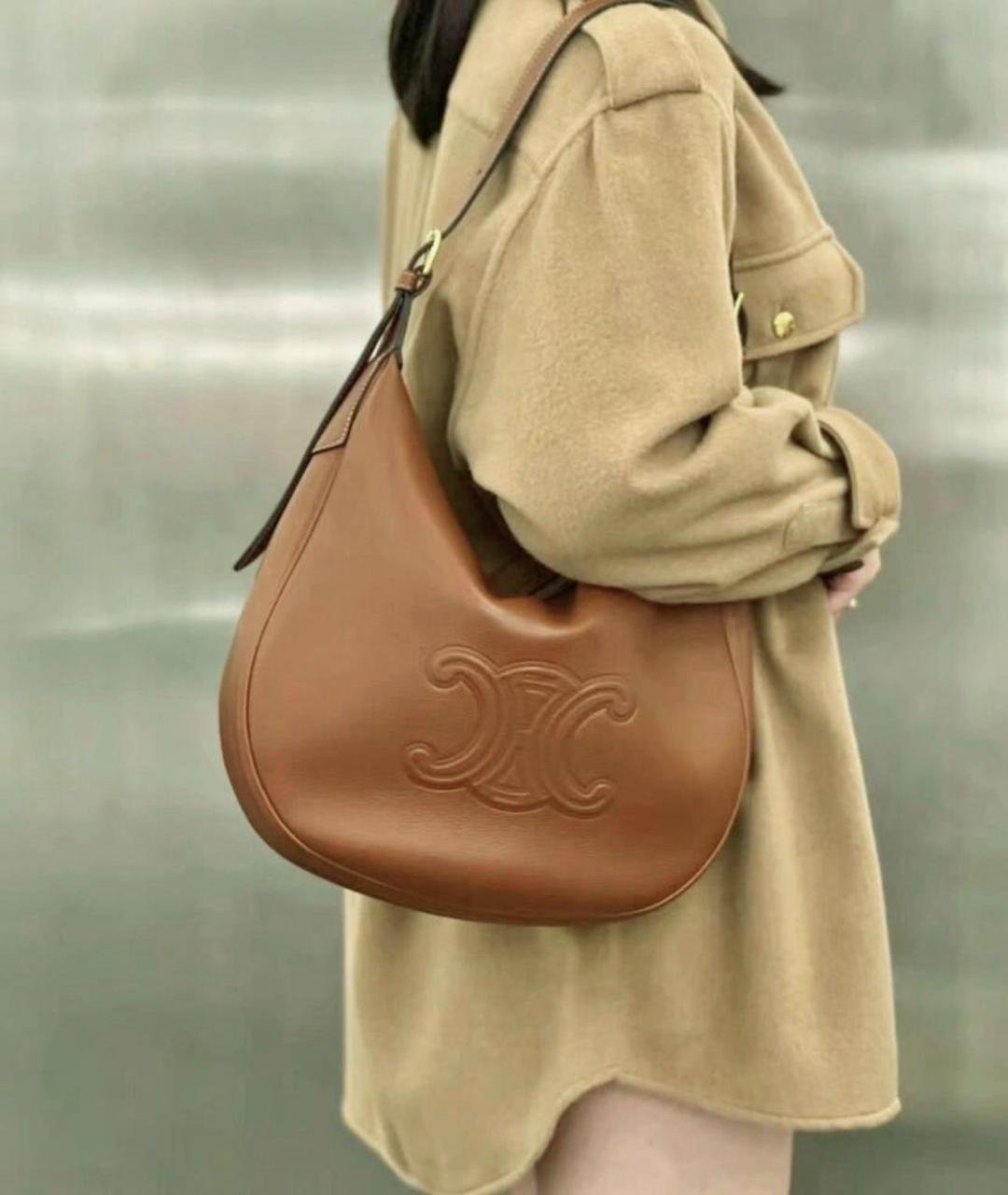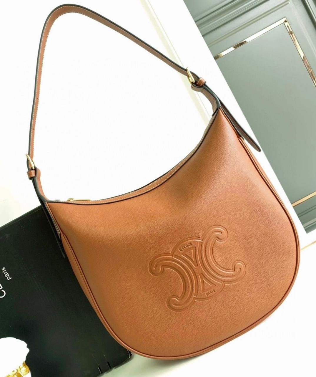 حقيبة Celine Heloise، موديل “Cuir Triomphe”. تتميز هذه الحقيبة بتصميم “هوبو” (Hobo) كلاسيكي مع شعار Triomphe البارز في المنتصف.