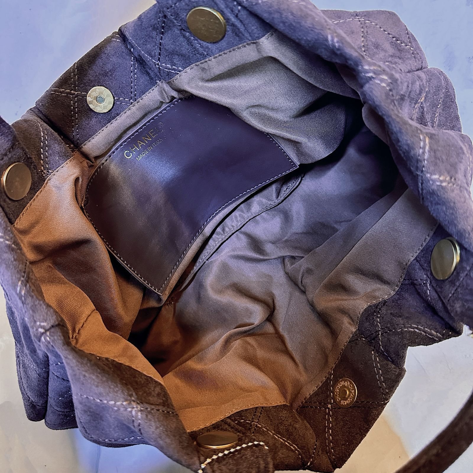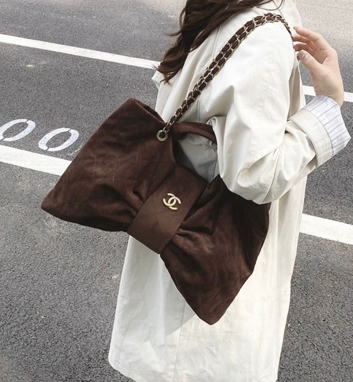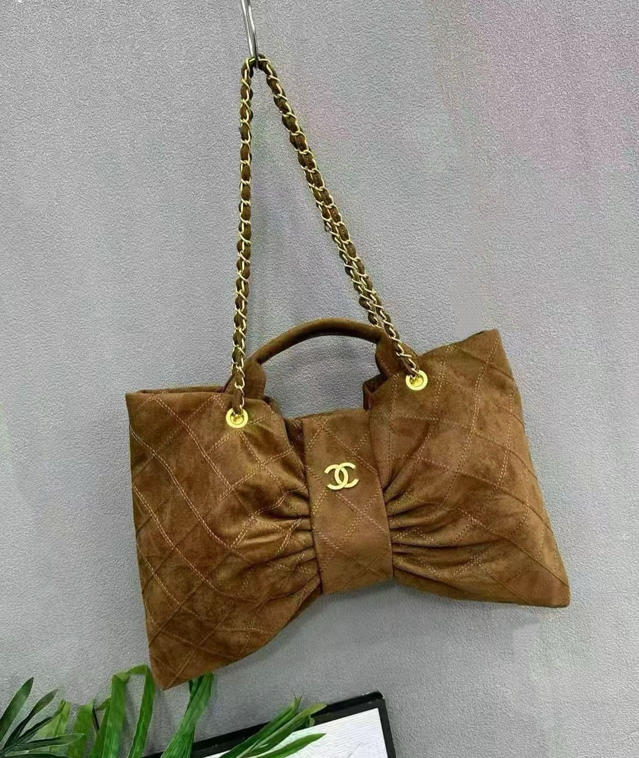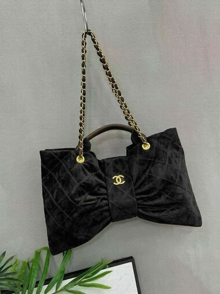 حقيبة شانيل ماكسي بو (Chanel Maxi Bow Bag)، وهي تتميز بتصميمها الفريد على شكل فيونكة (أو فراشة) ومصنوعة من خامات ناعمة مثل جلد الغزال (Suede) أو النايلون بتأثير المخمل.