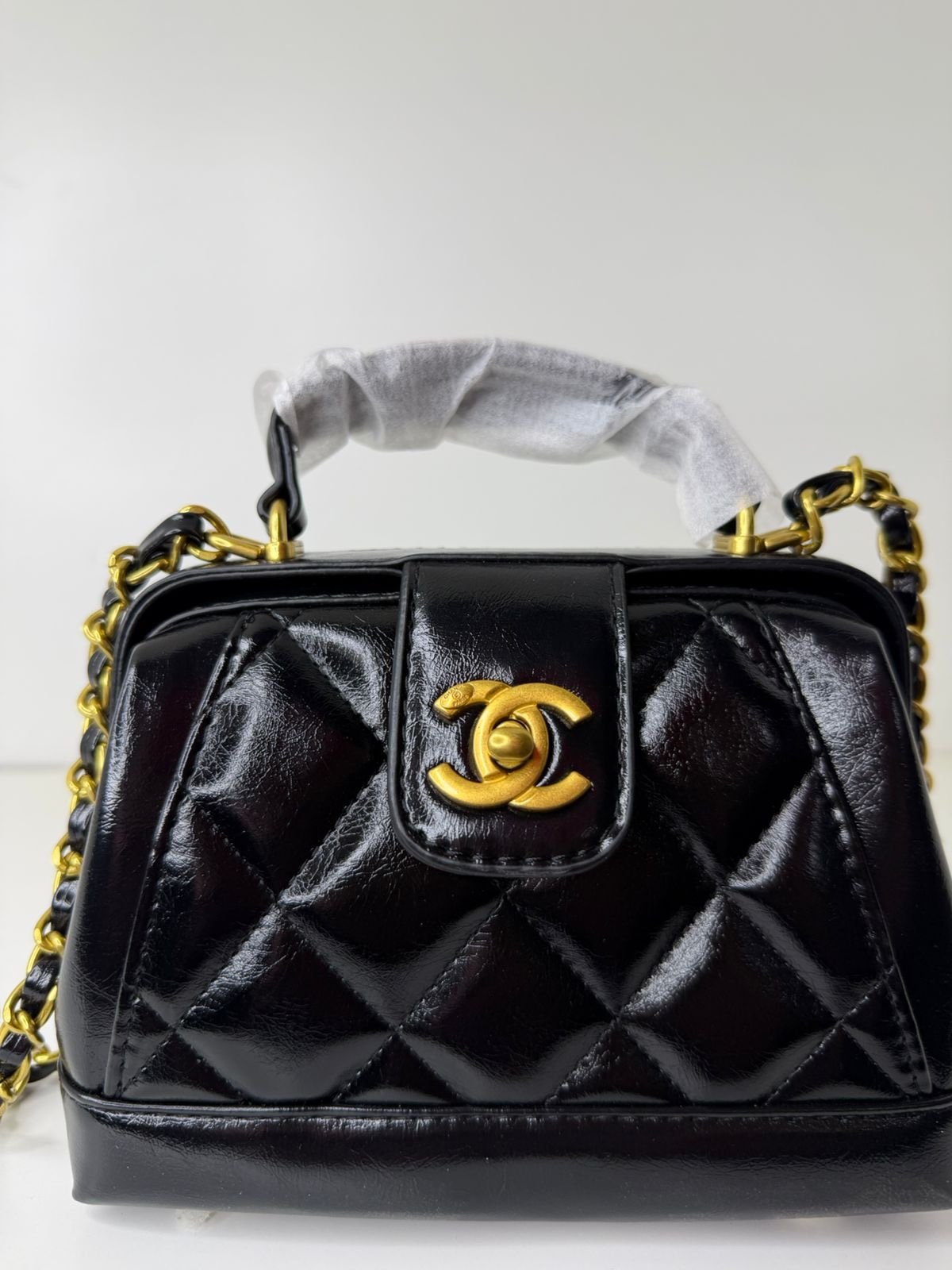 شانيل (Chanel) الحديثة لعام 2024، وتحديداً ضمن مجموعة “Doctor Bag” أو “24A”. تتميز الحقيبة بتصميمها المبطن الكلاسيكي (Quilted) مع مقبض علوي وشعار شانيل الذهبي البارز.
