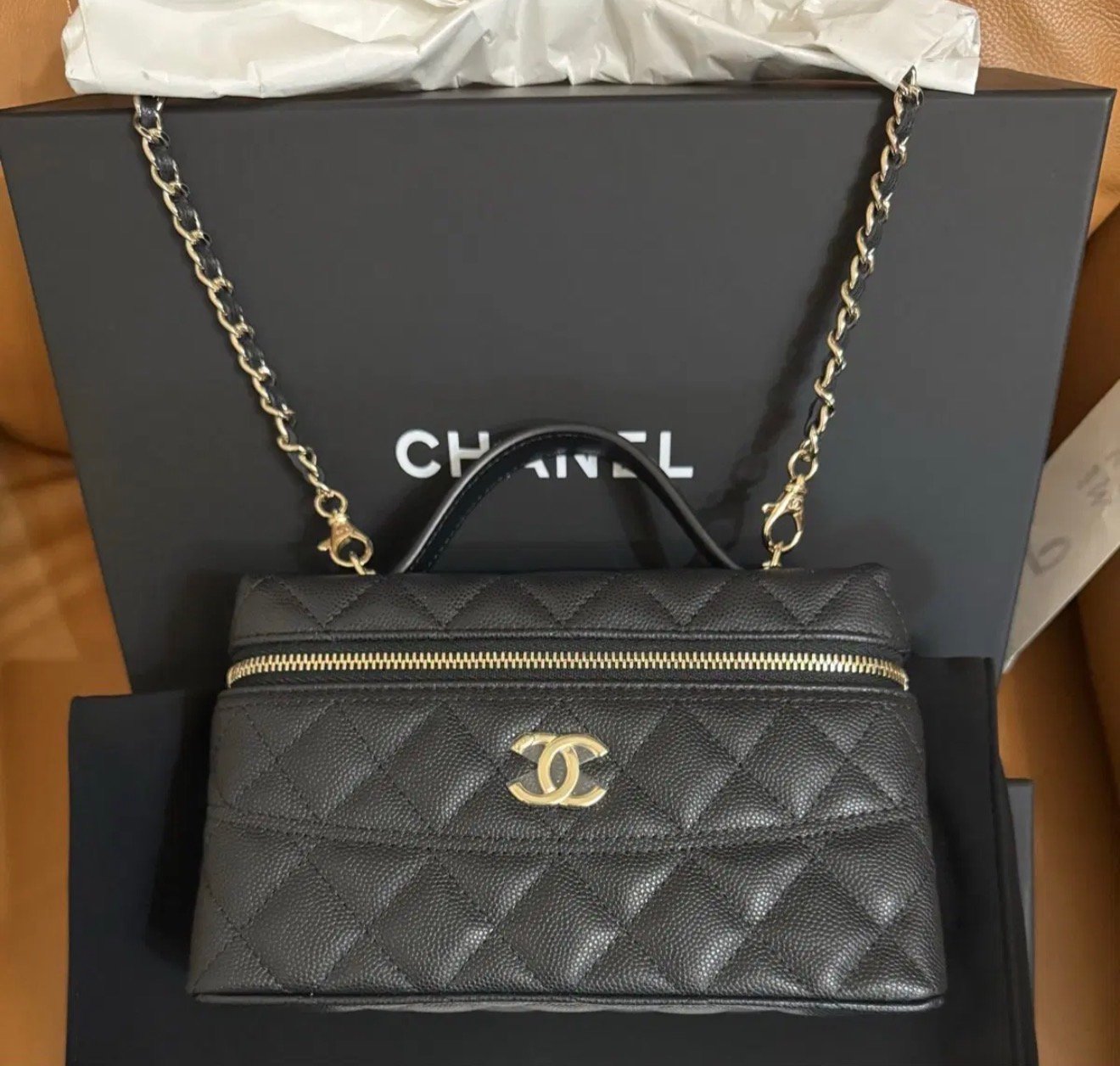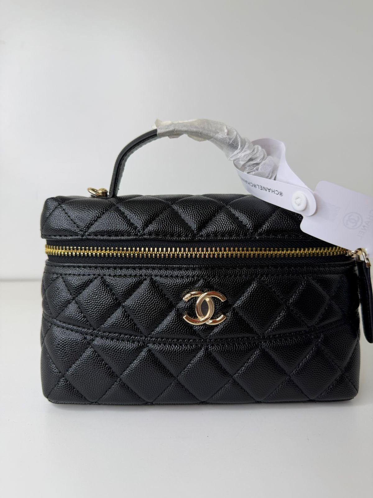 Chanel CC Top Handle Long Vanity Case with Chain الأنيقة. تتميز هذه الحقيبة بتصميمها الكلاسيكي المصنوع من جلد الكافيار الأسود الفاخر (Shiny Caviar Leather) مع لمسات من المعدن الذهبي الفاتح.