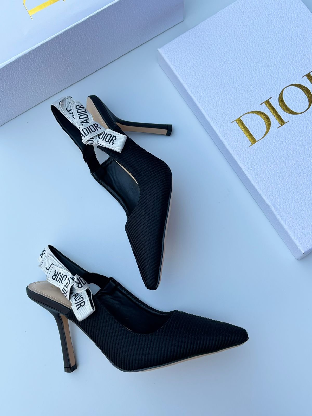 مجموعة من أحذية J’Adior ذات الكعب العالي والمفتوحة من الخلف (slingback pumps) من تصميم دار ديور (Dior). يُعد هذا الطراز أيقونة عصرية لدار ديور، ويتميز بشريط خلفي مطرز بعبارة “J’Adior” بلونين.