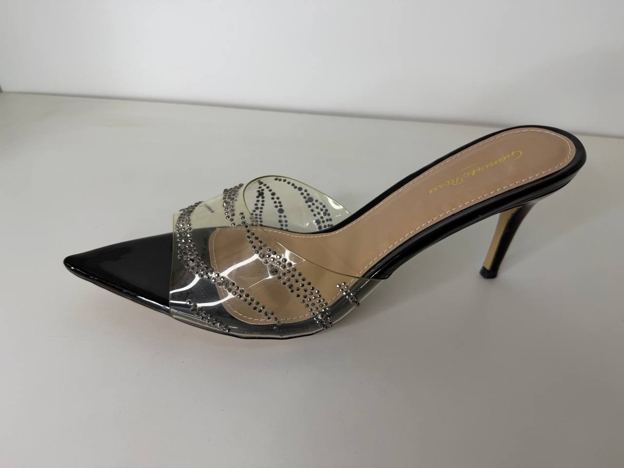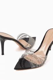 حذاء من تصميم العلامة الفاخرة Gianvito Rossi، وتحديداً موديل Elle 85 المرصع بالكريستال. يتميز بتصميمه العصري الذي يجمع بين الجلد الأسود والجزء العلوي الشفاف (PVC) المزين بحبيبات الكريستال المتلألئة وكعب رفيع بارتفاع 85 ملم