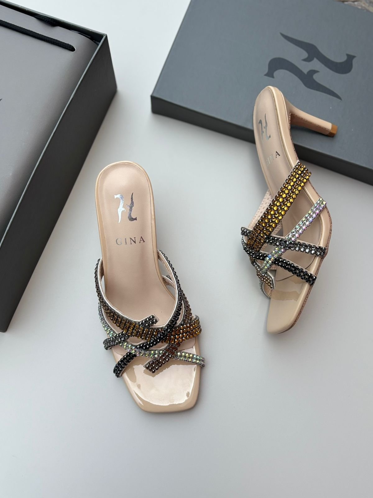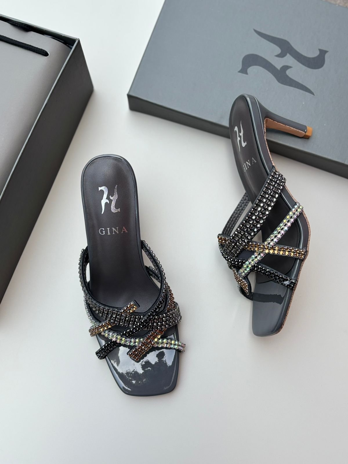 صندل نسائي من ماركة جينا (Gina)، وهي علامة تجارية فاخرة تشتهر بتصاميمها المزينة بالكريستال والحرفية العالية.