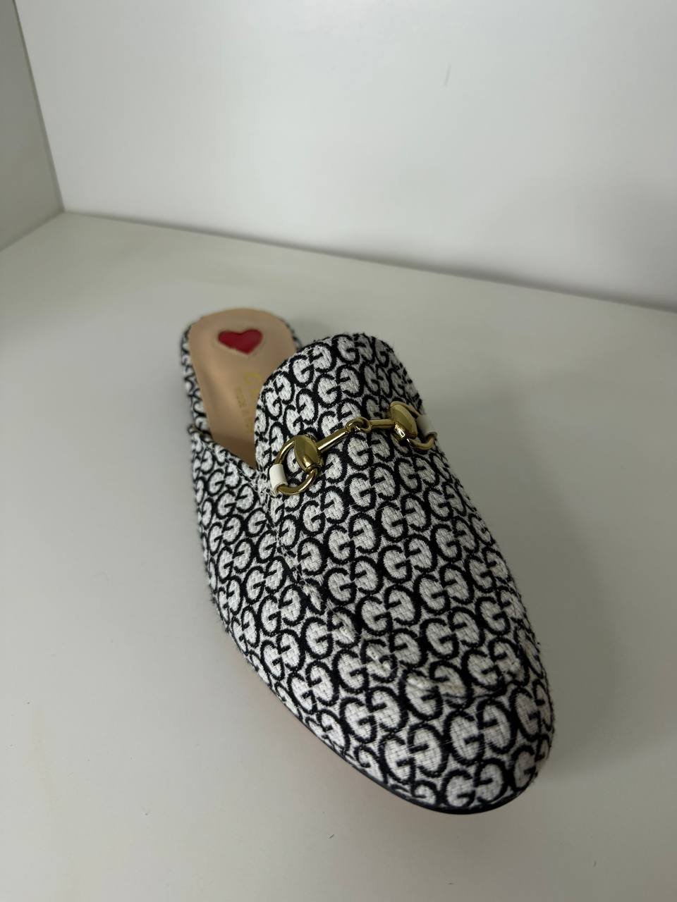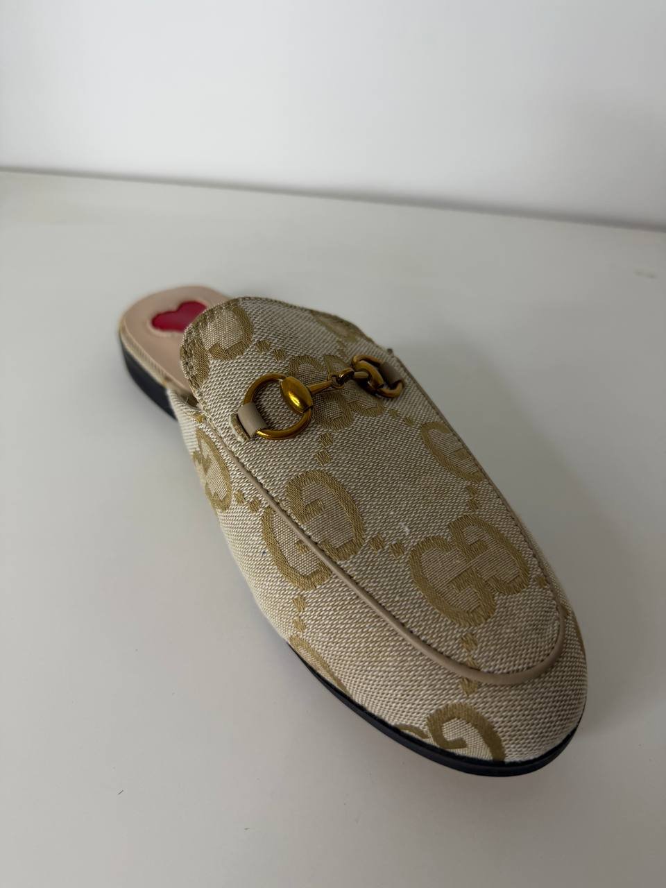 حذاء Princetown المفتوح من الخلف (Princetown Slipper) من العلامة التجارية الفاخرة Gucci. يتميز هذا الموديل تحديداً باستخدام قماش الكانفاس المزين بنقش GG الأيقوني، مع القطعة المعدنية الذهبية المميزة (Horsebit) في مقدمة الحذاء.