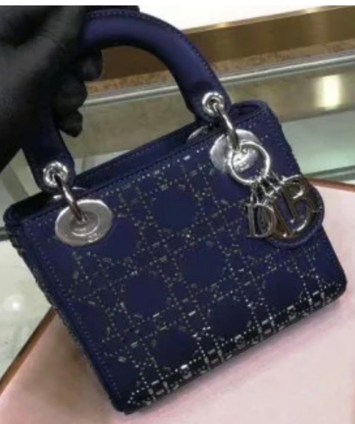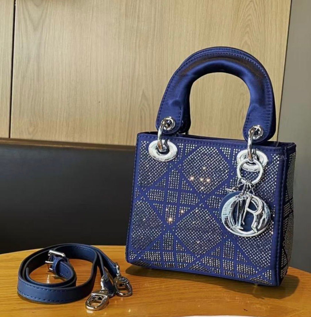 حقيبة ليدي ديور ميني (Mini Lady Dior Bag) من تصميم دار ديور (Christian Dior). تتميز الحقيبة باللون الكحلي (Navy Blue) وهي مصنوعة من قماش الساتان الفاخر المزين بنقشة “كاناج” (Cannage) الشهيرة للدار، والمرصعة بـ حبيبات الكريستال اللامعة.