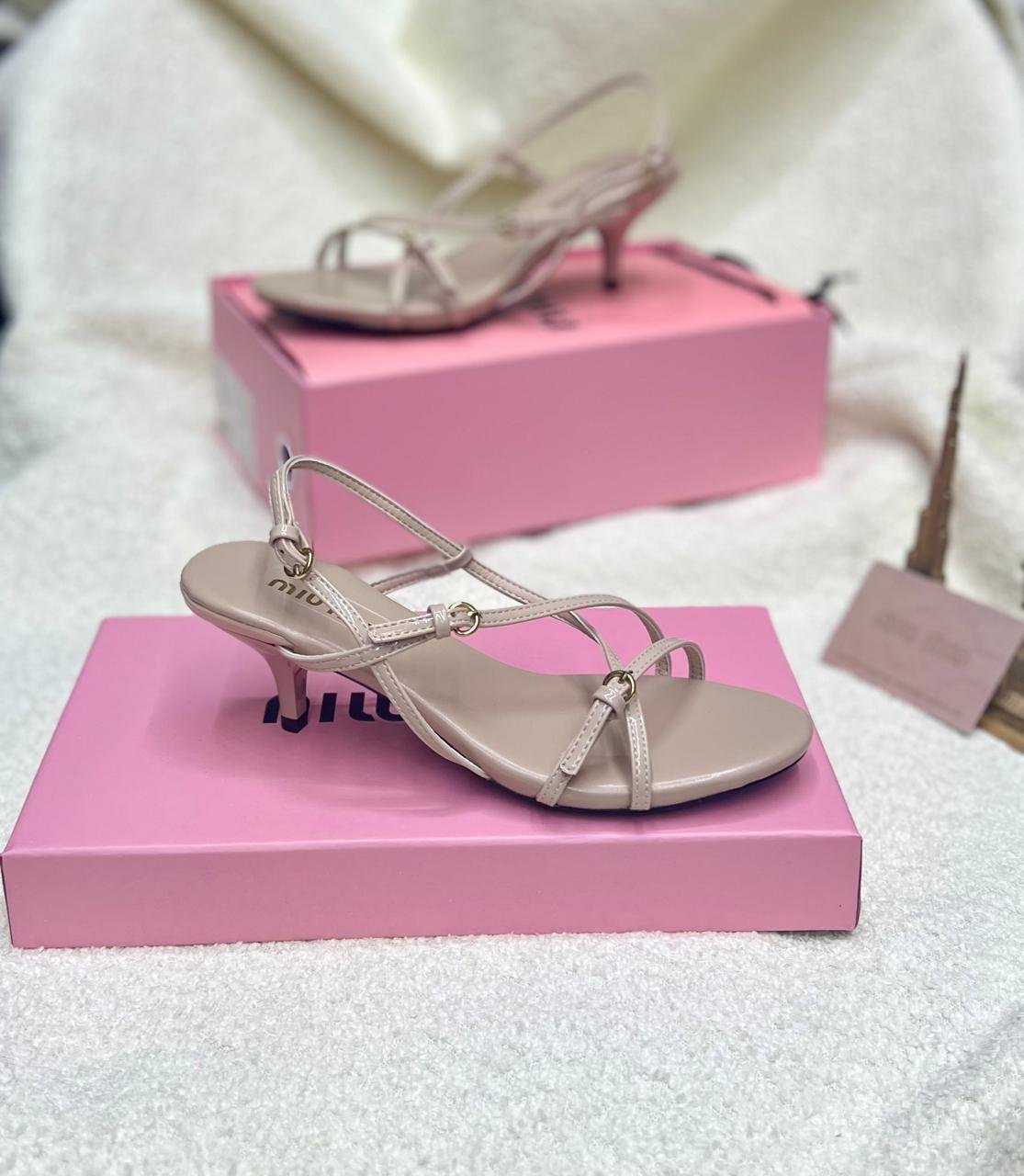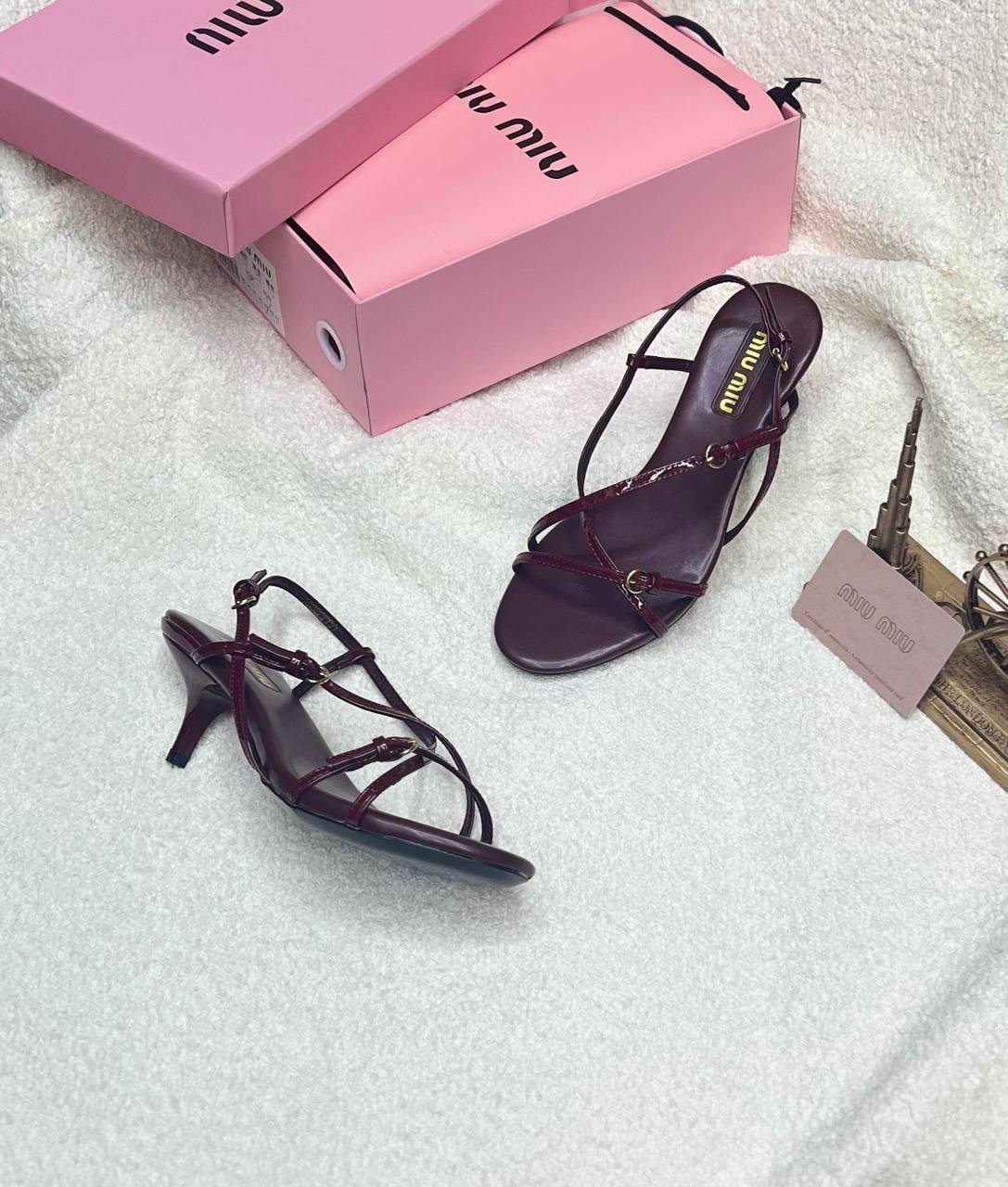 صنادل نسائية من الجلد اللامع من العلامة التجارية ميو ميو (Miu Miu). تتميز هذه الصنادل بأحزمة رفيعة متقاطعة مزينة بأبازيم معدنية صغيرة وكعب منخفض (Kitten heel) يبلغ ارتفاعه حوالي 5.5 إلى 6 سم.