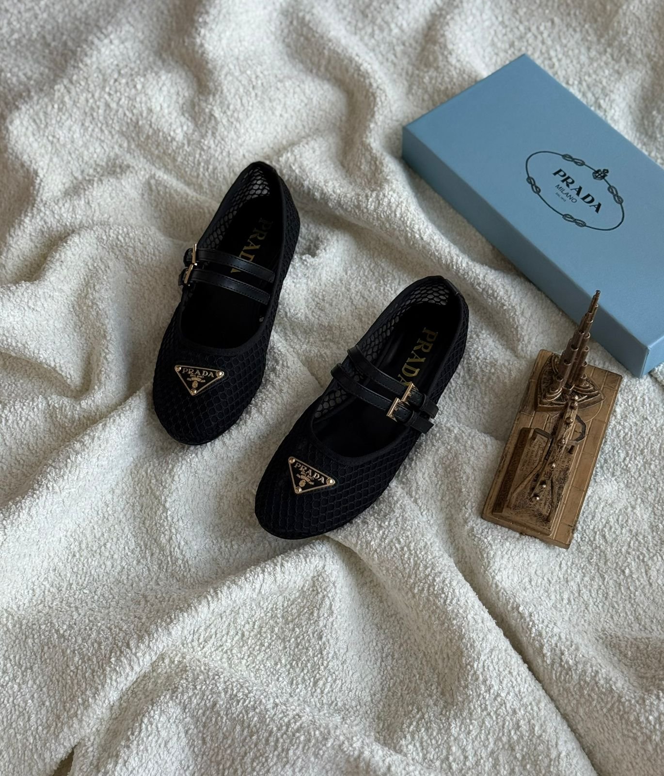 حذاء باليرينا من القماش الشبكي (Mesh fabric ballerinas) من تصميم دار الأزياء الإيطالية الشهيرة برادا (Prada). يتميز هذا الموديل بتصميم أنثوي يجمع بين الحرفية التقليدية واللمسات العصرية، حيث يأتي بزخارف “المكرمية” (macramé) اليدوية على نسيج شبكي شفاف.