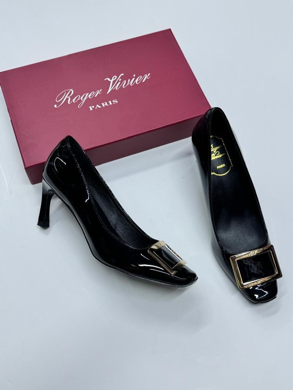أحذية الكعب العالي الظاهرة في الصورة هي من تصميم العلامة التجارية الفاخرة روجيه فيفييه (Roger Vivier)، وتحديداً من مجموعتي ترومبيت (Trompette) وبيل فيفييه (Belle Vivier). تشتهر هذه الأحذية بإبزيمها المعدني المربع المميز وتصميمها الكلاسيكي المصنوع غالباً من الجلد اللامع (Patent Leather).