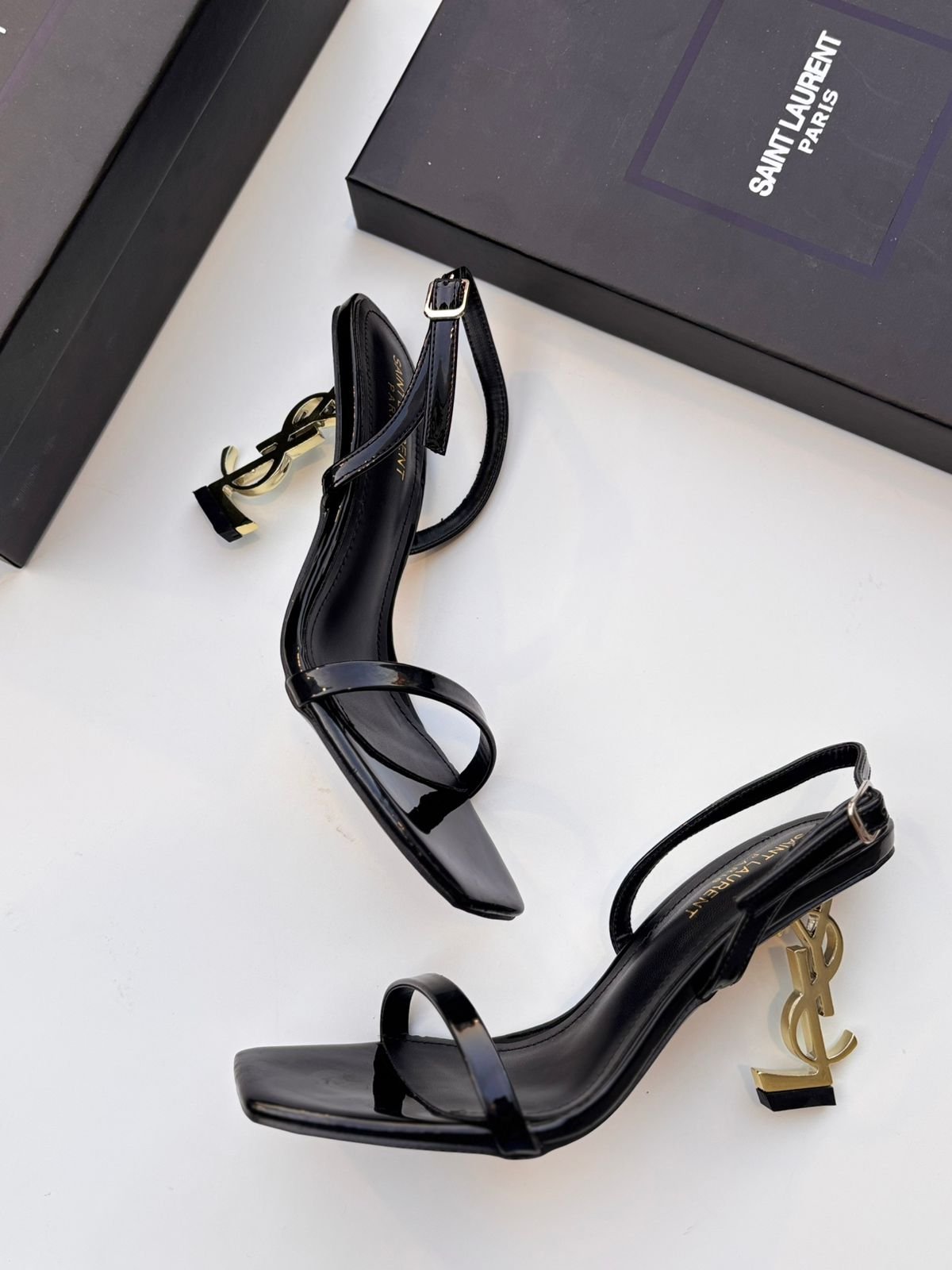صندل “أوبيوم” (Opyum) من العلامة التجارية الفرنسية الفاخرة سان لوران (Saint Laurent). يشتهر هذا التصميم بكعبه المعدني الذي يتخذ شكل شعار العلامة الأيقوني “YSL” (كاساندرا).