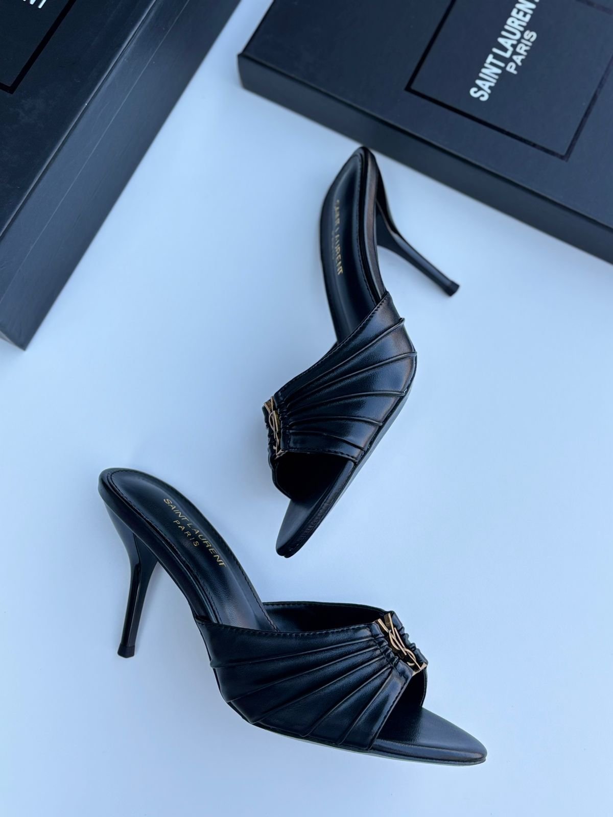حذاء “بابيلون” (Babylone) من دار سان لوران (Saint Laurent) الباريسية. يتميز هذا الموديل بتصميم “ميول” (Mule) مفتوح من الخلف مع مقدمة مدببة وفتحة أمامية صغيرة (Peep-toe).