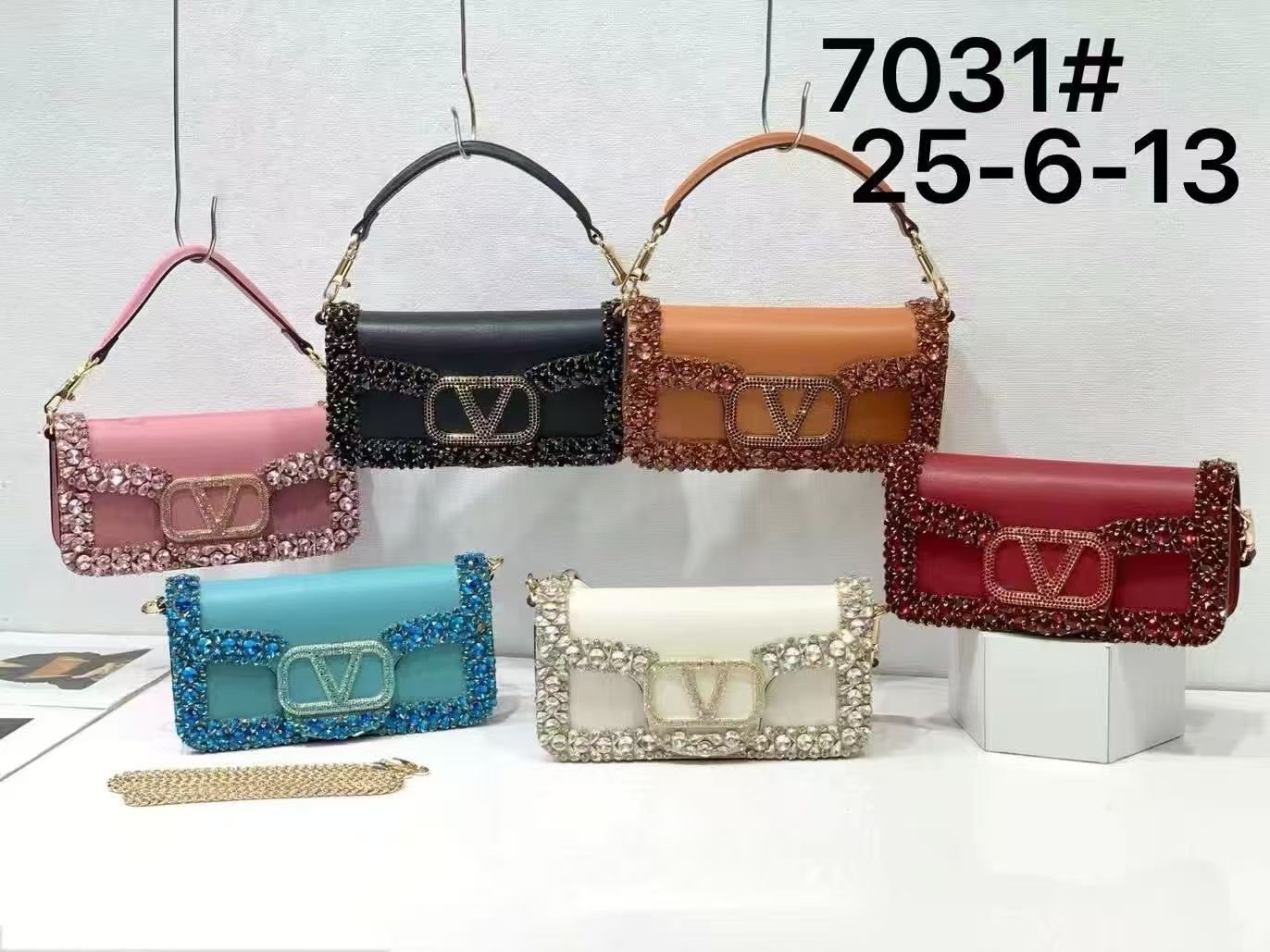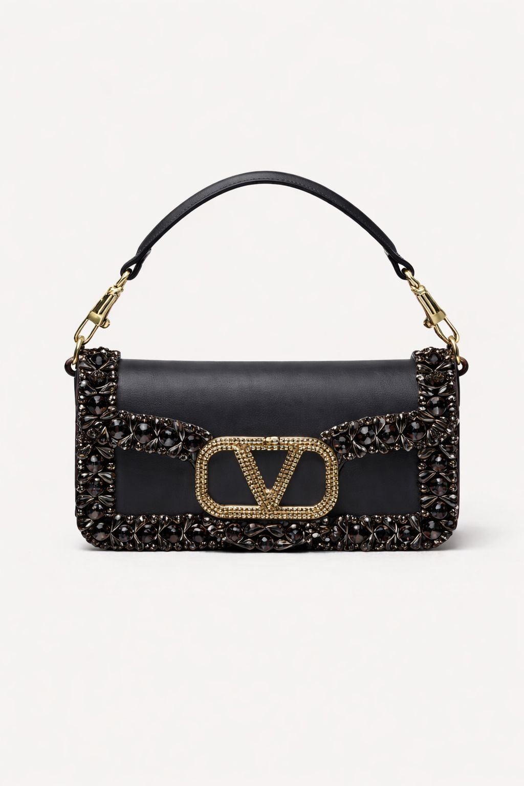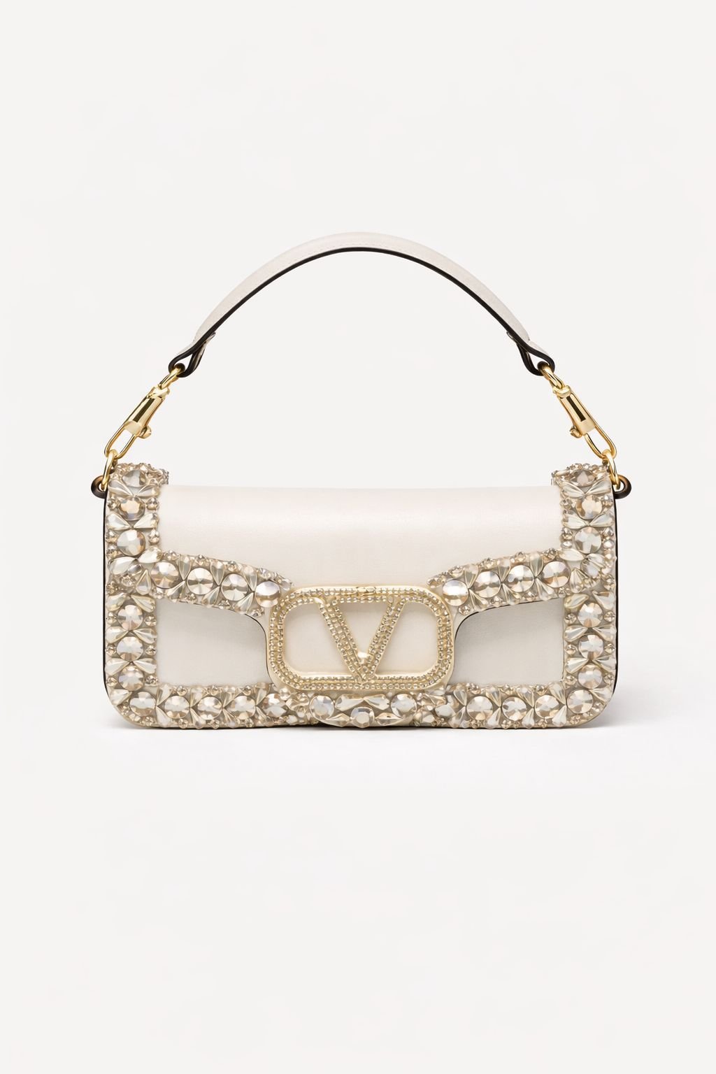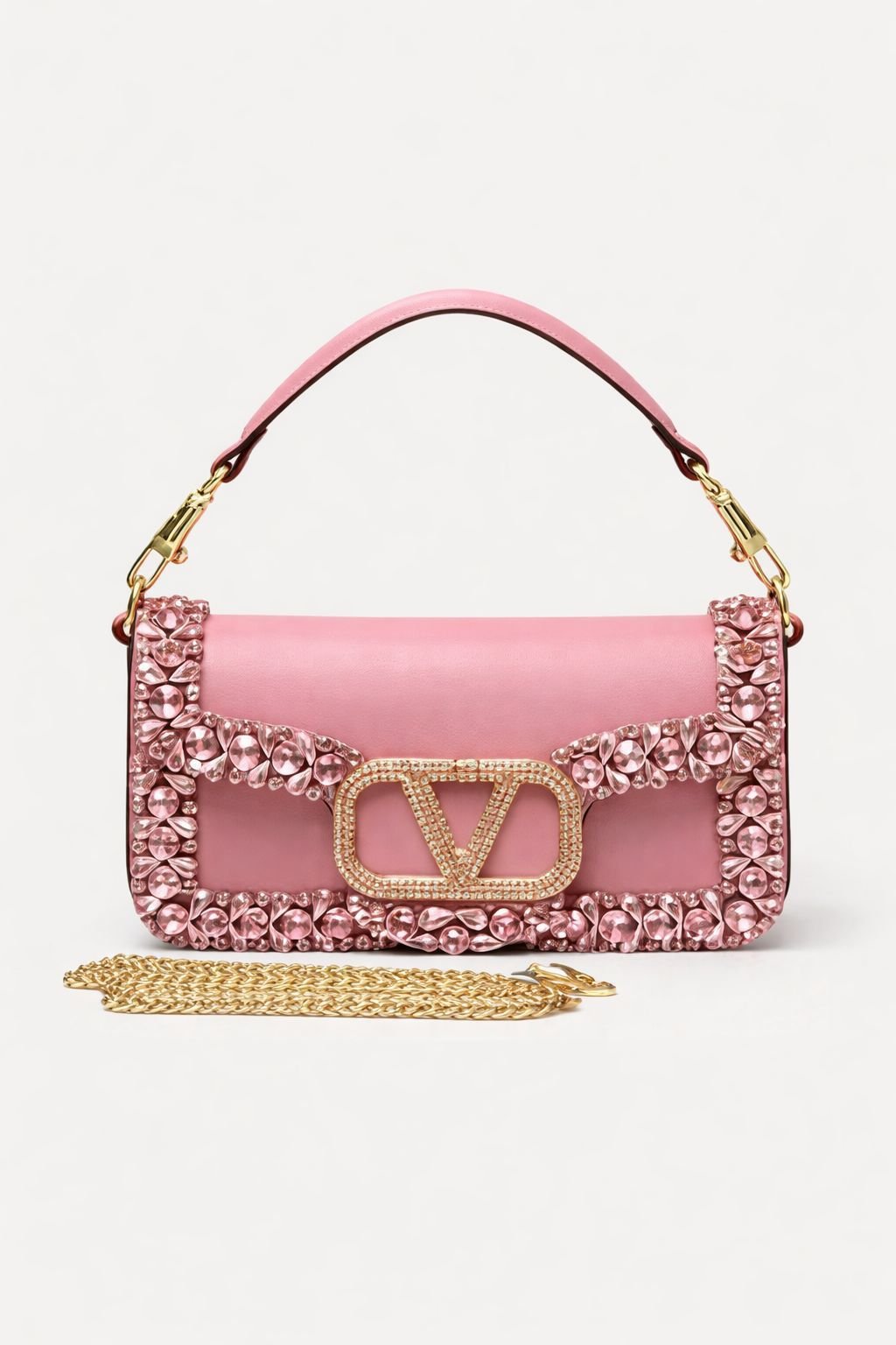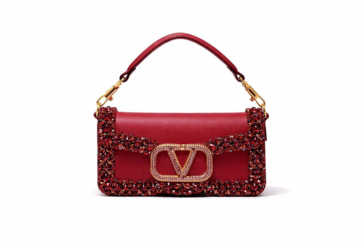 حقائب من مجموعة فالنتينو غارافاني لوكو (Valentino Garavani Locò)، وتحديداً الموديلات الصغيرة المزينة بأحجار الراين والكريستال. تتميز هذه الحقائب بشعار حرف V (VLogo Signature) الشهير للماركة، والذي يكون في هذه الموديلات مرصعاً بالكريستال أو أحجار سواروفسكي.