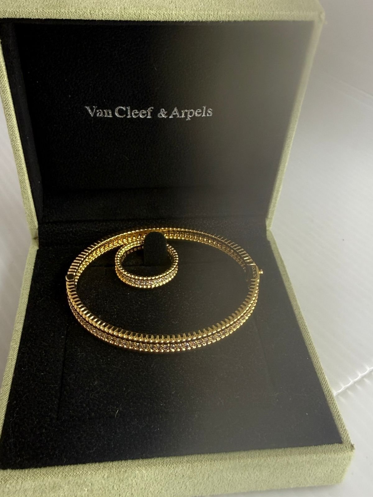 طقم من الإكسسورات الفاخرة من دار فان كليف أند آربلز (Van Cleef & Arpels)، وتحديداً من مجموعة بيرلي (Perlée) الشهيرة، وتحديداً خط “بيرلي دايموندز” (Perlée Diamonds).
