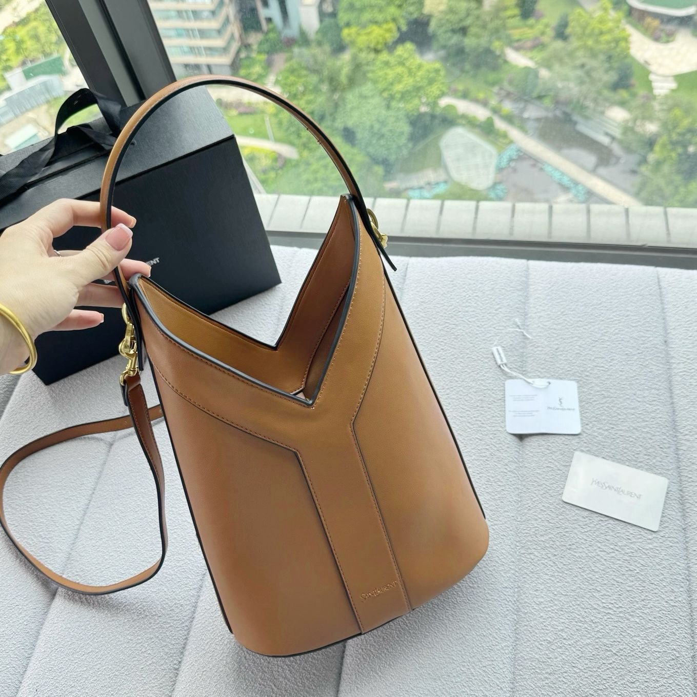 عرف الحقائب المعروضة في الصورة باسم حقيبة “باكيت واي” (Y bucket bag) ذات المقبض العلوي من دار سان لوران (Saint Laurent). يتميز هذا التصميم بجلد ناعم وقصة هندسية على شكل حرف Y مستوحاة من أرشيف الدار من حقبة السبعينيات.